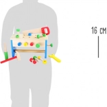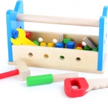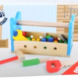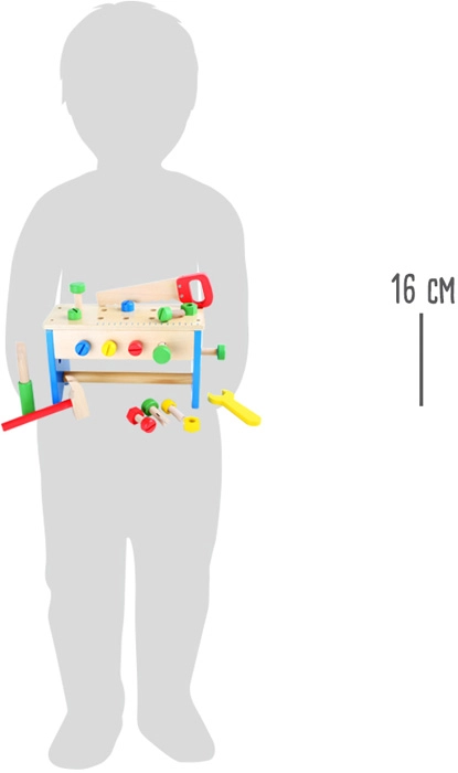 L’ensemble comprend une panoplie complète d’outils – tournevis, clé, marteau et scie – ainsi que des vis et écrous colorés pour d’innombrables combinaisons de vissage. Le jeu stimule les capacités de coordination, la pensée logique et la patience.