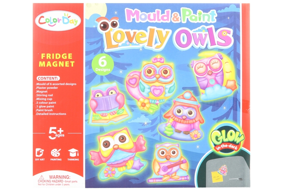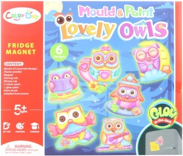 Kit créatif pour enfants permettant de fabriquer facilement des aimants en forme de petites chouettes qui brillent dans le noir. Le coffret contient tout le nécessaire – plâtre, moule avec 6 motifs, peintures, pinceau, aimants et mode d’emploi. Un divertissement idéal dès 5 ans et un excellent cadeau pour les petits créateurs.
