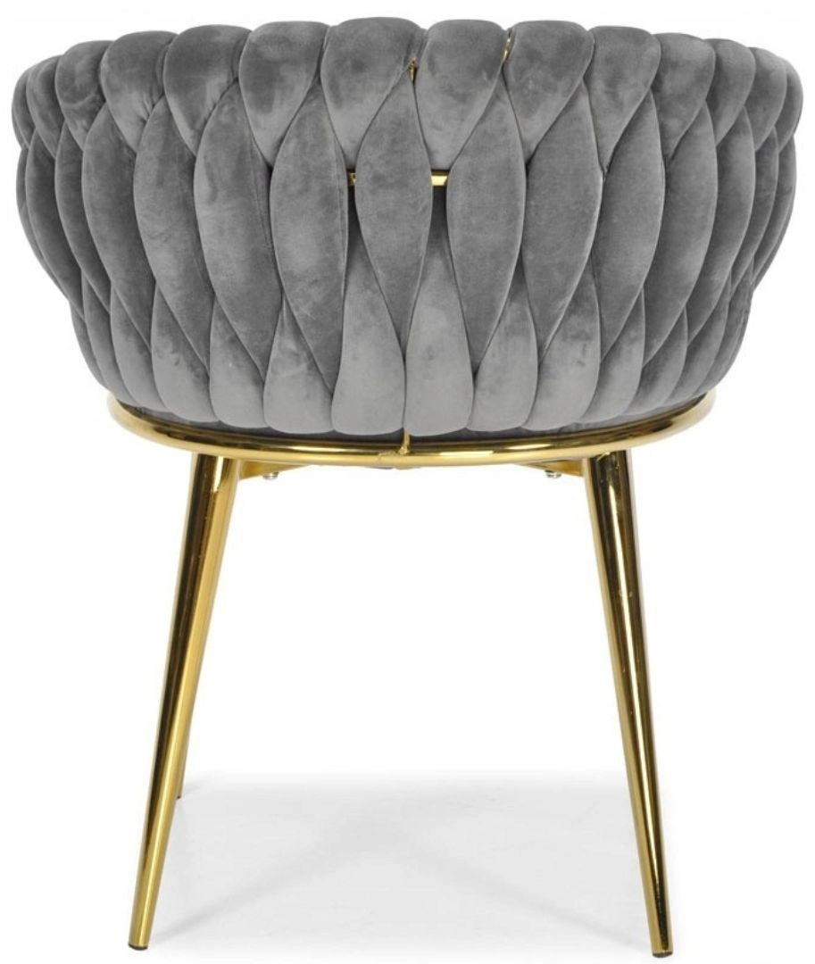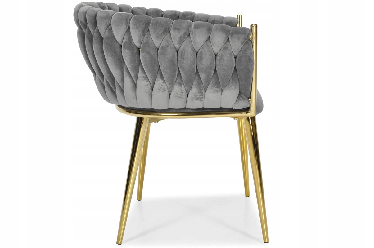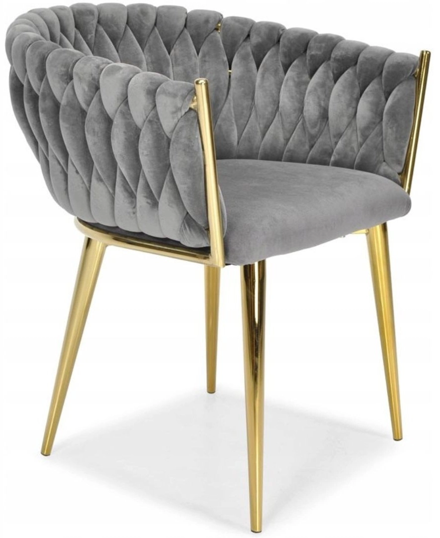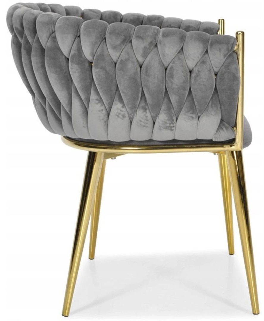 Élégante chaise pour salle à manger ou salon dans un gris intemporel, combinant un revêtement en velours, des pieds métalliques dorés et un dossier tressé 3D remarquable. La forme ergonomique avec accoudoirs assure un confort même lors d’assises prolongées, tandis que la structure métallique stable offre durabilité et longue vie.