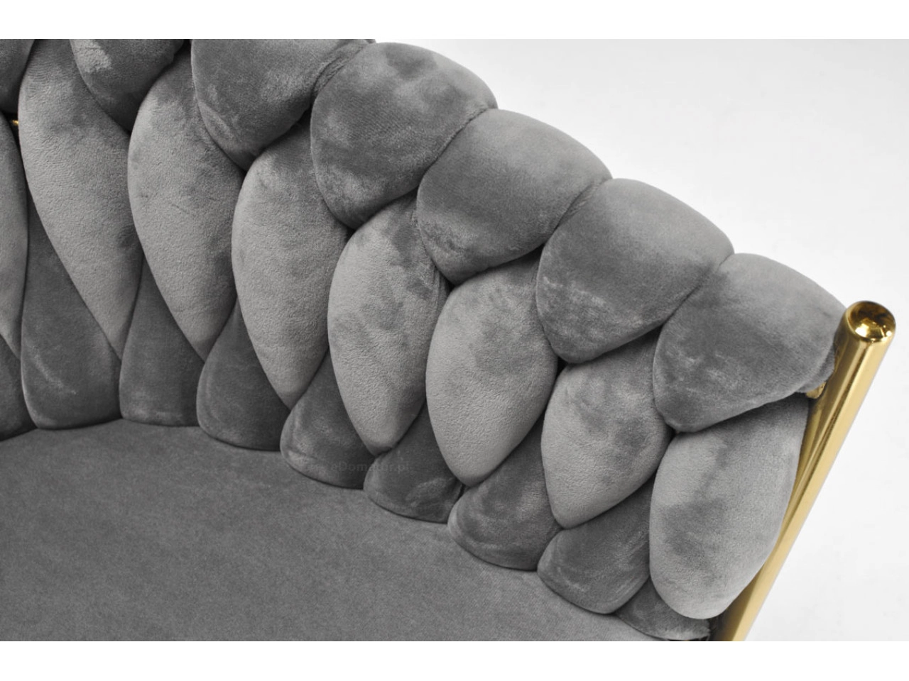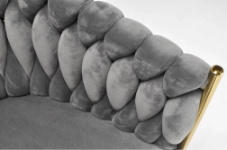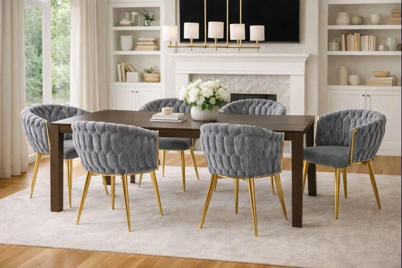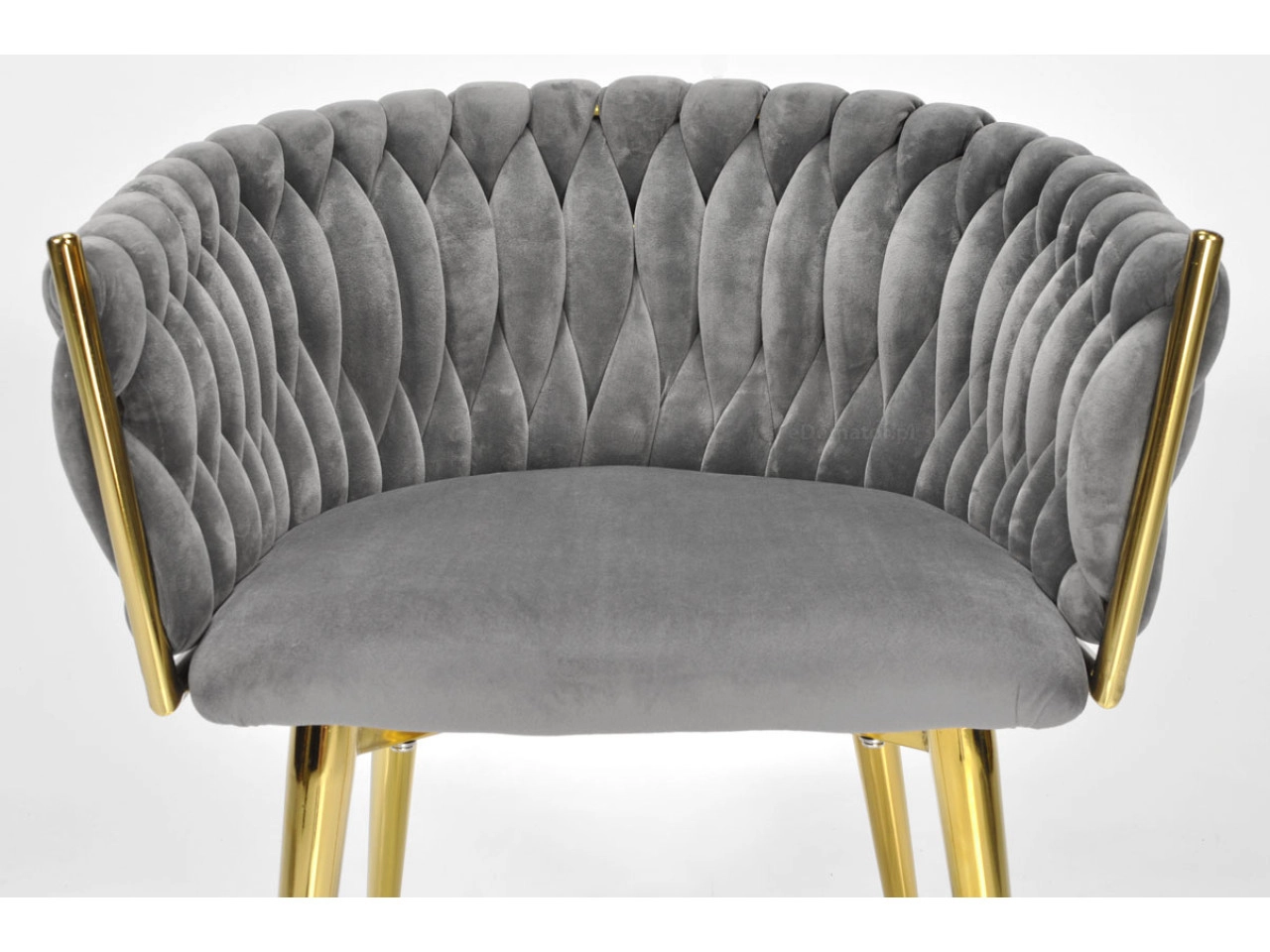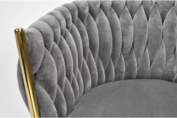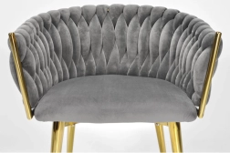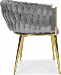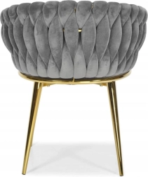 Élégante chaise pour salle à manger ou salon dans un gris intemporel, combinant un revêtement en velours, des pieds métalliques dorés et un dossier tressé 3D remarquable. La forme ergonomique avec accoudoirs assure un confort même lors d’assises prolongées, tandis que la structure métallique stable offre durabilité et longue vie.