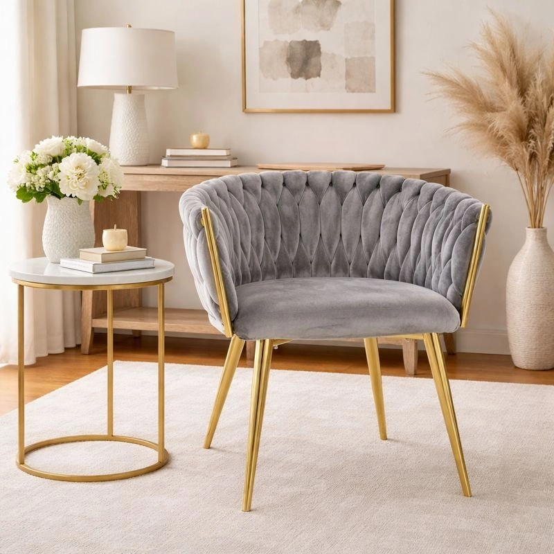 Cette chaise en velours stylée apporte un effet « waouh » immédiat à votre intérieur. Le velours gris subtilement brillant se marie parfaitement avec des accents dorés, le noir, le blanc et le bois naturel. Le revêtement tressé 3D du dossier offre une allure luxueuse et fait de la chaise la pièce maîtresse de la salle à manger, du salon ou du coin coiffeuse.