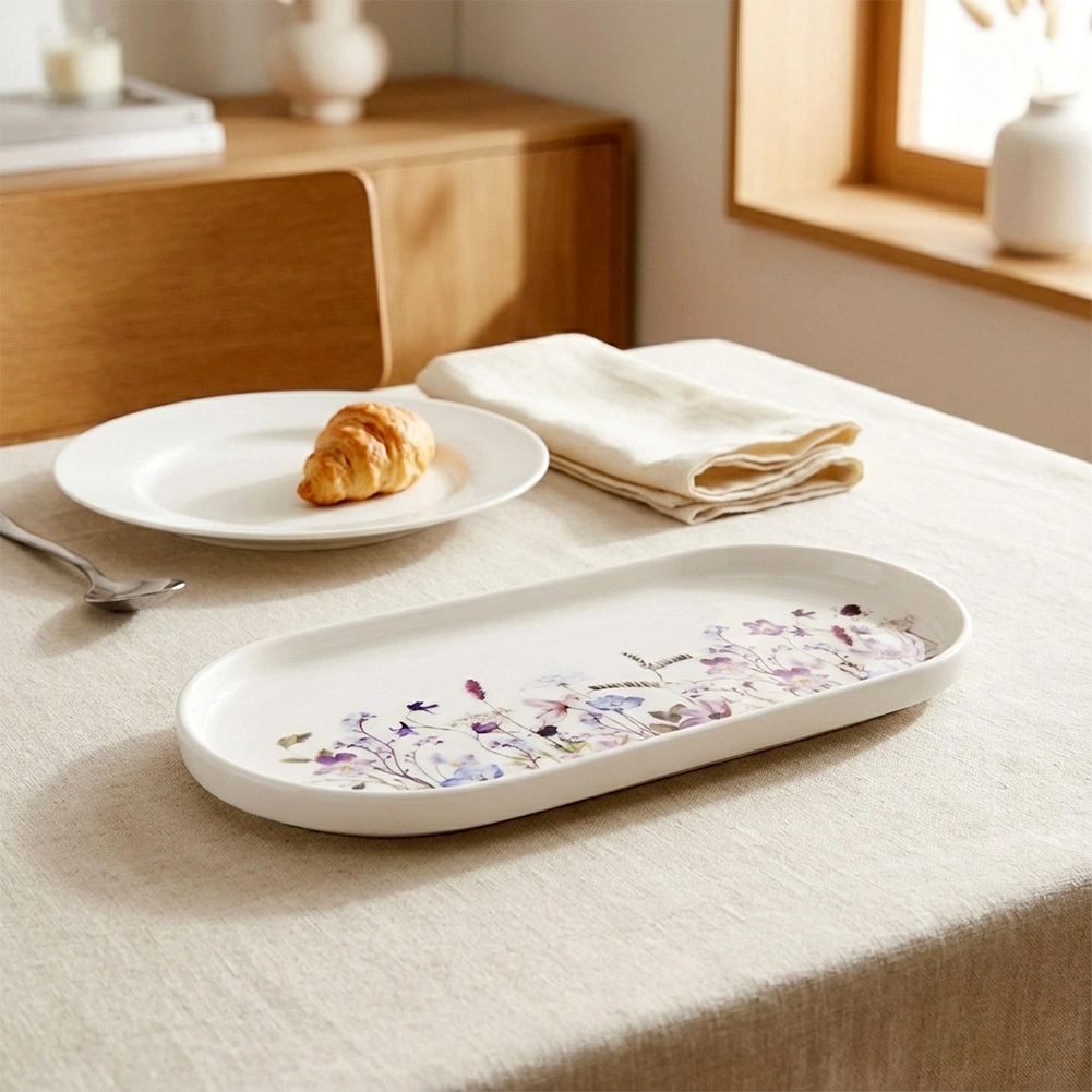 Élégante assiette ovale en porcelaine avec motif de fleurs des prés, idéale pour servir des entrées, des desserts ou des amuse-bouches. Grâce à ses dimensions de 25 × 12 cm et à son bord légèrement relevé, elle est à la fois stylée et pratique. Compatible lave-vaisselle et micro-ondes, porcelaine de qualité et design floral moderne en font un excellent choix au quotidien comme pour une table de fête.