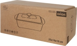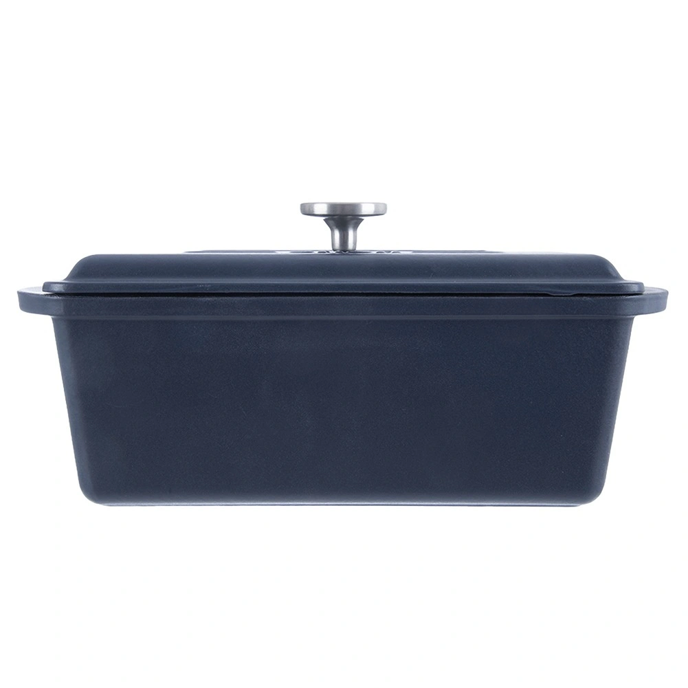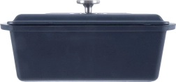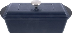 Dimensions extérieures sans couvercle 35 × 14 × 11 cm, avec couvercle hauteur 16 cm, capacité 3 l. Corps de couleur noire, couvercle bleu foncé avec poignée en acier inoxydable pour une manipulation sûre. Le moule dispose de poignées latérales pour un transport confortable et, grâce à sa résistance jusqu’à 250 °C, peut être utilisé au four comme sur les plaques.