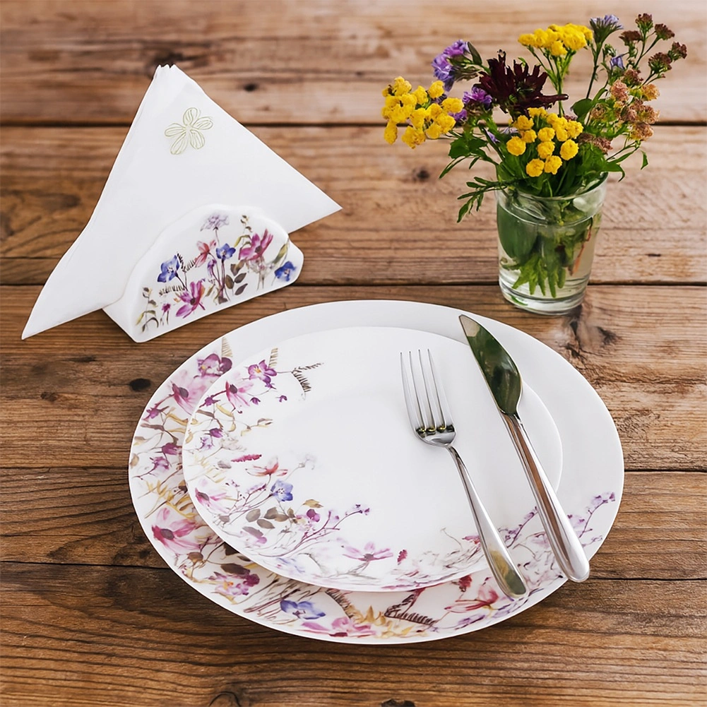 La porcelaine blanche avec un motif pastel de fleurs des champs apporte charme et fraîcheur au dressage – s’accorde parfaitement aux intérieurs modernes comme rustiques.