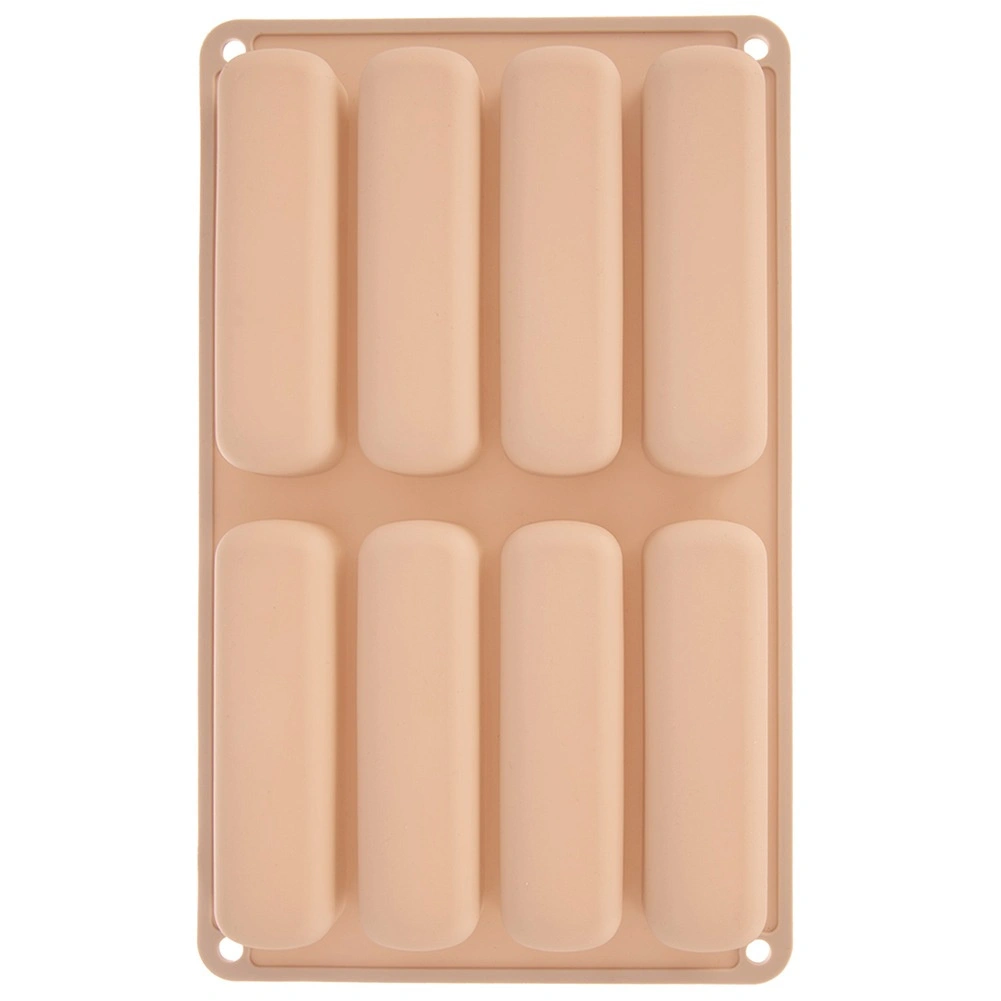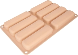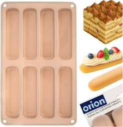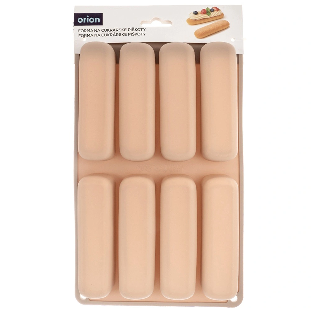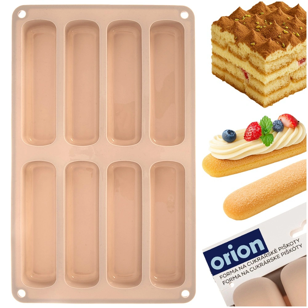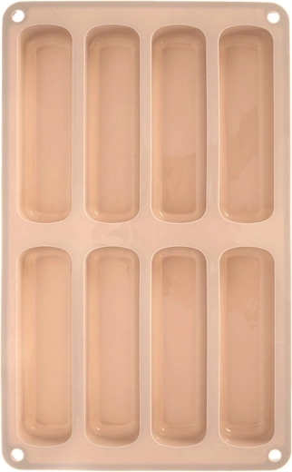 Ce moule en silicone beige est idéal pour réaliser des boudoirs allongés pour tiramisu, desserts en verrine ou biscuits classiques. Les dimensions du moule sont 28 × 17 × 2 cm et chaque pièce mesure 11,5 × 3 × 2 cm. Léger, souple et durable, le matériau garantit une cuisson uniforme et un démoulage facile sans adhérence.