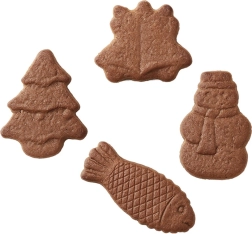 Le moule propose des sapins en deux tailles, un bonhomme de neige, des cloches et un poisson – idéal pour des biscuits et des chocolats au style festif.