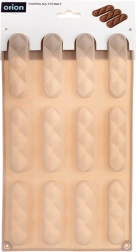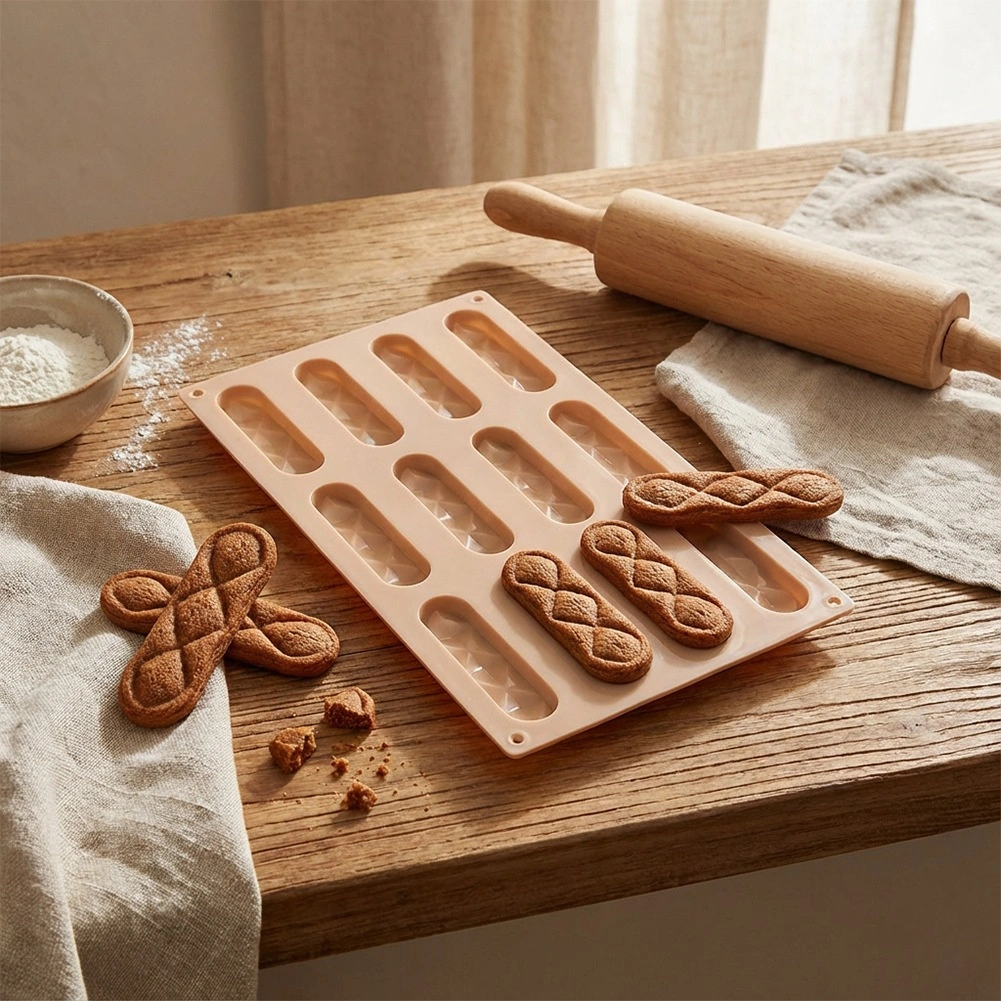 Ce moule en silicone beige doté de 12 cavités longitudinales (chacune env. 8 × 2 × 1 cm) est idéal pour des biscuits à la vanille, au cacao ou aux noix, des barres ou des pralines maison. Grâce au silicone souple, la pâtisserie se démoule facilement après la cuisson et conserve une forme uniforme avec une texture attrayante.