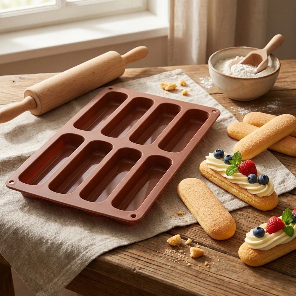 Ce moule en silicone marron est idéal pour une cuisson uniforme de biscuits à la cuillère allongés, avec une forme et une taille toujours régulières. Grâce à sa flexibilité, les pièces se démoulent facilement et l’entretien est aisé. Parfait pour préparer du tiramisu, des desserts en verrine et de légers biscuits à la cuillère.