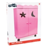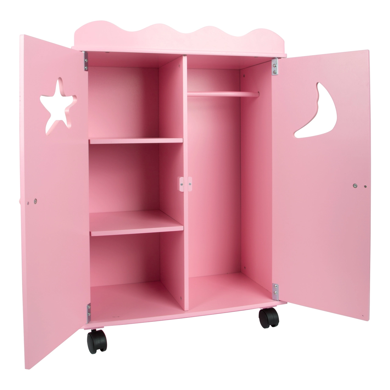 Cette armoire en bois de qualité, dans une douce teinte rose, est idéale pour organiser clairement les vêtements et accessoires de vos poupées. La partie gauche propose deux étagères pratiques, la partie droite est équipée d’une tringle pour les petites robes. La porte à fermeture magnétique se manipule facilement et les découpes étoile et lune apportent un charme supplémentaire au meuble.