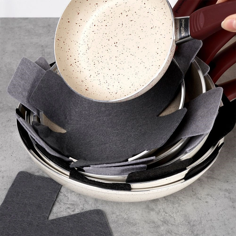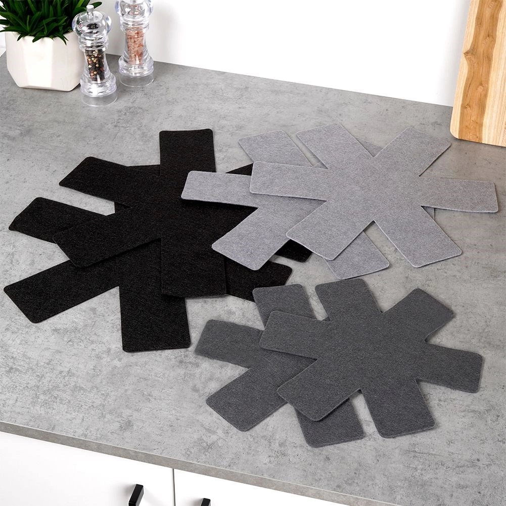 Ensemble pratique d’intercalaires en feutre pour empiler en toute sécurité poêles, casseroles et bols. Le lot comprend 6 pièces en trois tailles, qui empêchent de manière fiable les rayures sur les surfaces antiadhésives et économisent de la place dans les placards. Protège la vaisselle, évite les éraflures et permet un empilage sans souci.