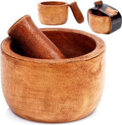 Pratique mortier en bois de manguier avec pilon ergonomique pour écraser facilement épices, herbes et graines. Il offre une construction solide, une résistance à l’humidité et aux déformations et un aspect naturel, ce qui en fait à la fois un excellent ustensile et un accessoire élégant pour toute cuisine.