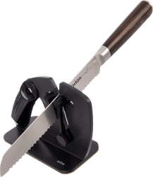 Le mécanisme à ressort s’adapte automatiquement à la lame et maintient le bon angle pour un affûtage homogène et délicat des couteaux lisses comme dentelés.