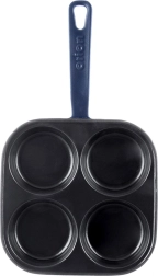 Poêle carrée en fonte de 20,5 × 20,5 cm avec quatre cavités séparées (Ø 9 cm) pour une préparation rapide d’œufs, de pancakes et de mini-crêpes avec une forme parfaite. Le revêtement émaillé noir minimise l’adhérence et facilite le service, tandis que l’extérieur et la poignée bleus apportent une touche élégante.