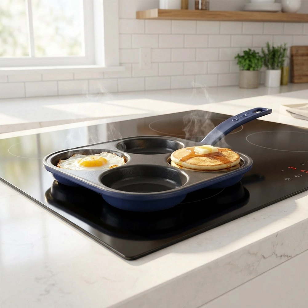 Quatre cavités rondes (Ø 9 cm) maintiennent les œufs et la pâte bien en place – idéal pour des pancakes et des œufs au plat sans effort.