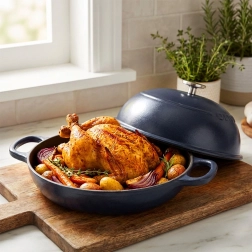 La conception tout en fonte avec revêtement émaillé conduit et retient remarquablement la chaleur. Extérieur bleu foncé, intérieur noir, poignée de couvercle en inox pour une manipulation sûre.