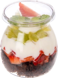 Les parois transparentes mettent en valeur les couches de crème, de fruits et de crumble – un look parfait pour sweet bar, mariage ou fête.
