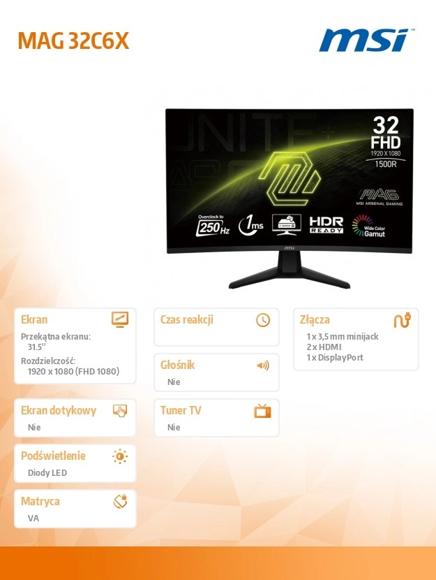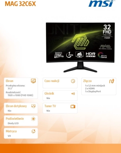Profitez d’un jeu fluide et d’une image nette avec le moniteur incurvé 31,5" MAG 32C6X. Grâce au taux de rafraîchissement 250 Hz, à la résolution Full HD et au panneau incurvé, il offre une réponse rapide, une immersion renforcée et un rendu des mouvements fluide sans déchirement.