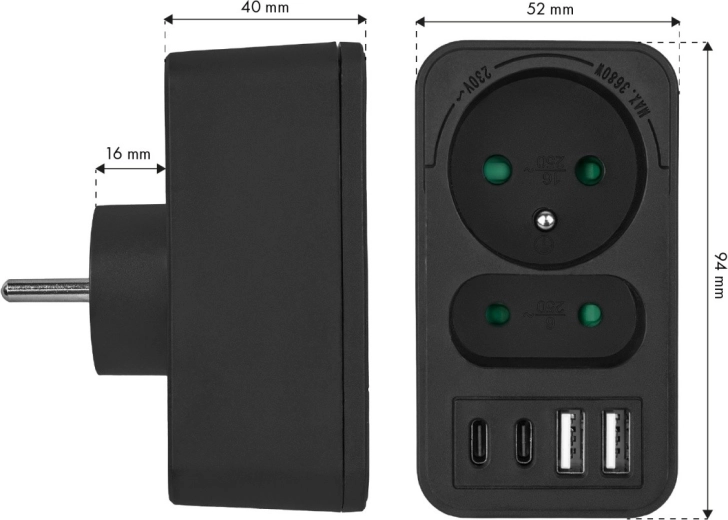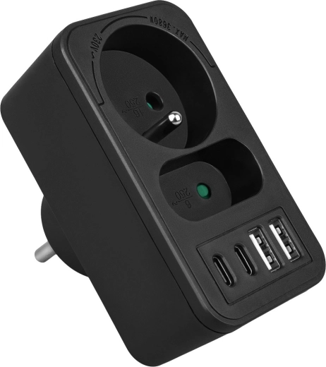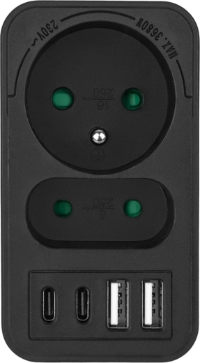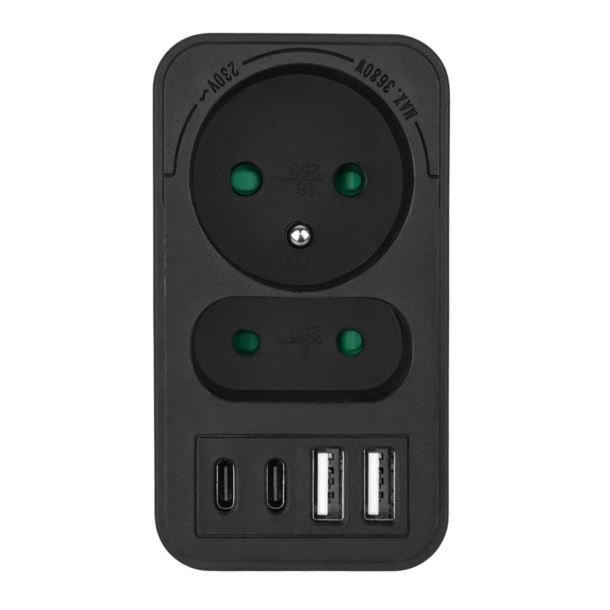 Une solution intelligente pour la maison et le bureau : cet adaptateur mural compact combine l’alimentation classique 230 V avec quatre sorties USB performantes. Il propose 1 prise Schuko avec terre pour les appareils à plus forte puissance et 1 prise Euro plate pour les petits appareils électroniques. La charge simultanée de plusieurs dispositifs devient simple et ordonnée.