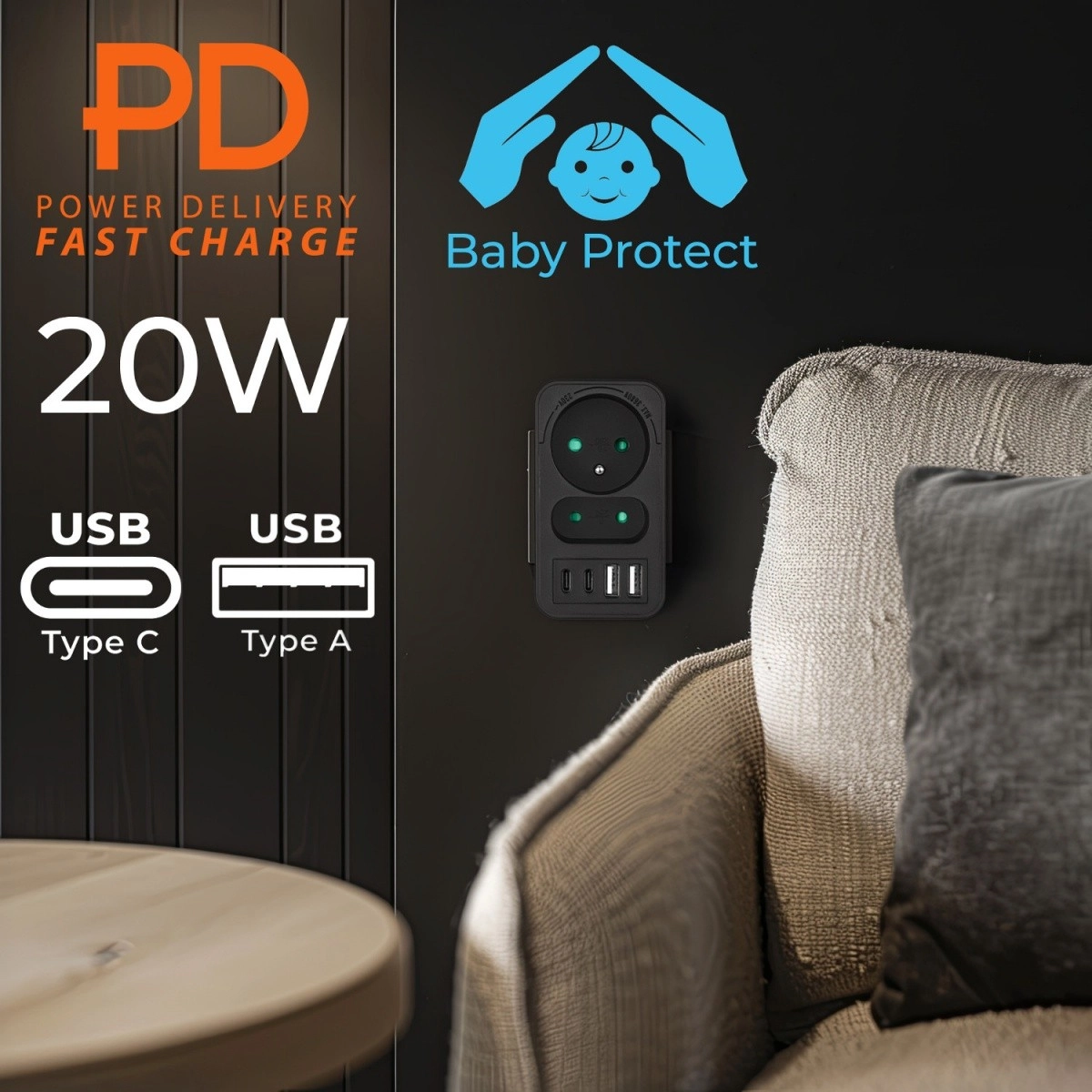 La section USB offre 2× USB‑A (jusqu’à 3 A / 18 W) pour les accessoires et 2× USB‑C avec PD (jusqu’à 20 W) pour une charge rapide et stable des smartphones et tablettes modernes. Grâce à la protection intégrée, la charge est sûre et efficace, idéale pour le salon, le bureau et la chambre.