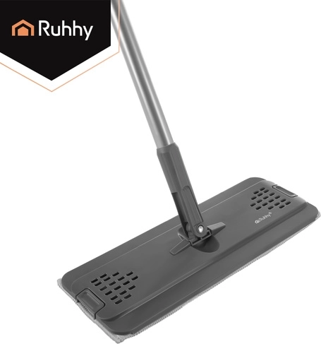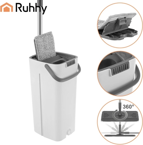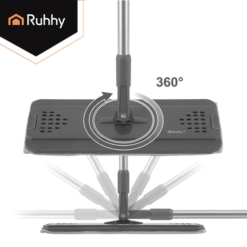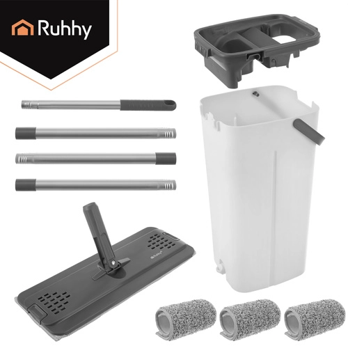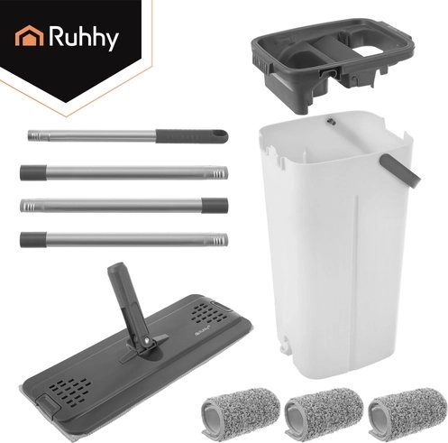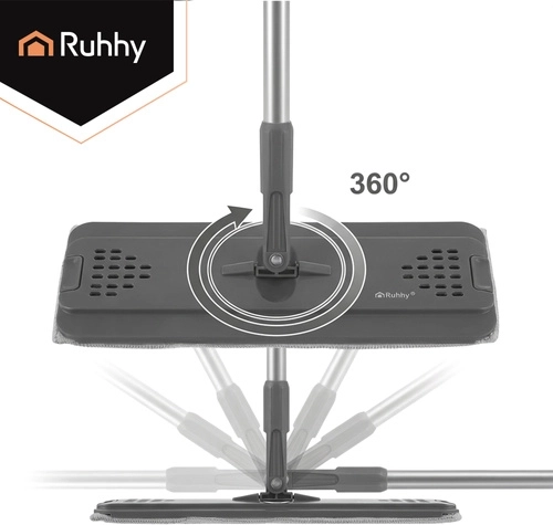Le balai à plat moderne RUHHY avec un seau à deux compartiments de 8,5 l sépare l’eau propre de l’eau sale pour un nettoyage hygiénique et efficace. L’essorage sans contact garde les mains au sec et règle l’humidité idéale de la housse sans goutter. La tête pivotante 360° à profil bas atteint facilement sous les meubles et dans les coins. Le pack comprend 3 housses en microfibre à séchage rapide pour des nettoyages fluides sans interruption.