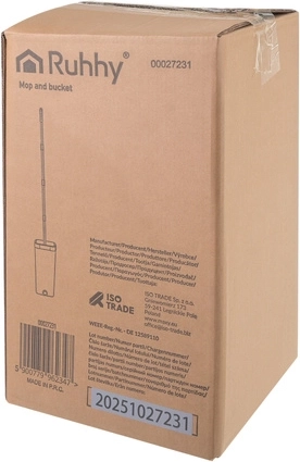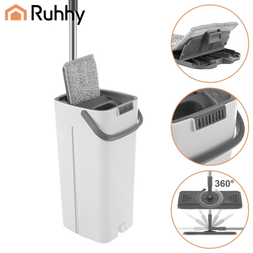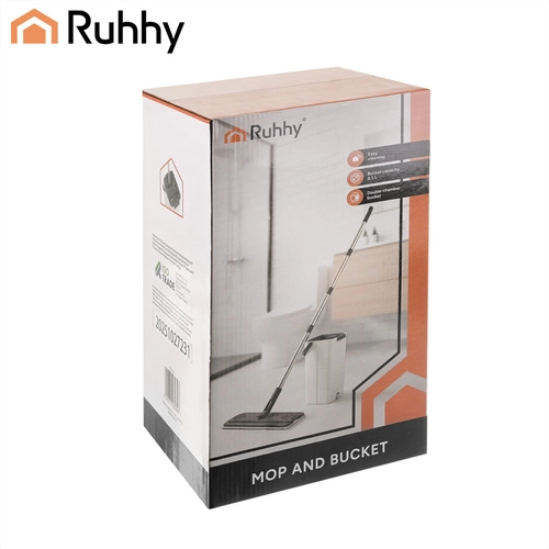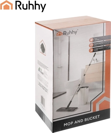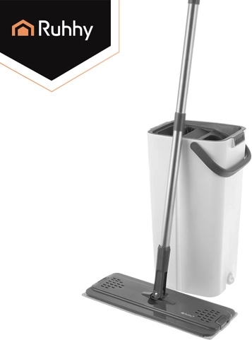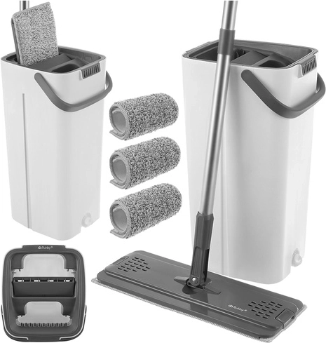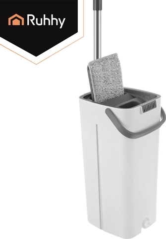 Balai à plat avec seau à deux compartiments 8,5 l RUHHY avec système d’essorage et 3 housses de rechange