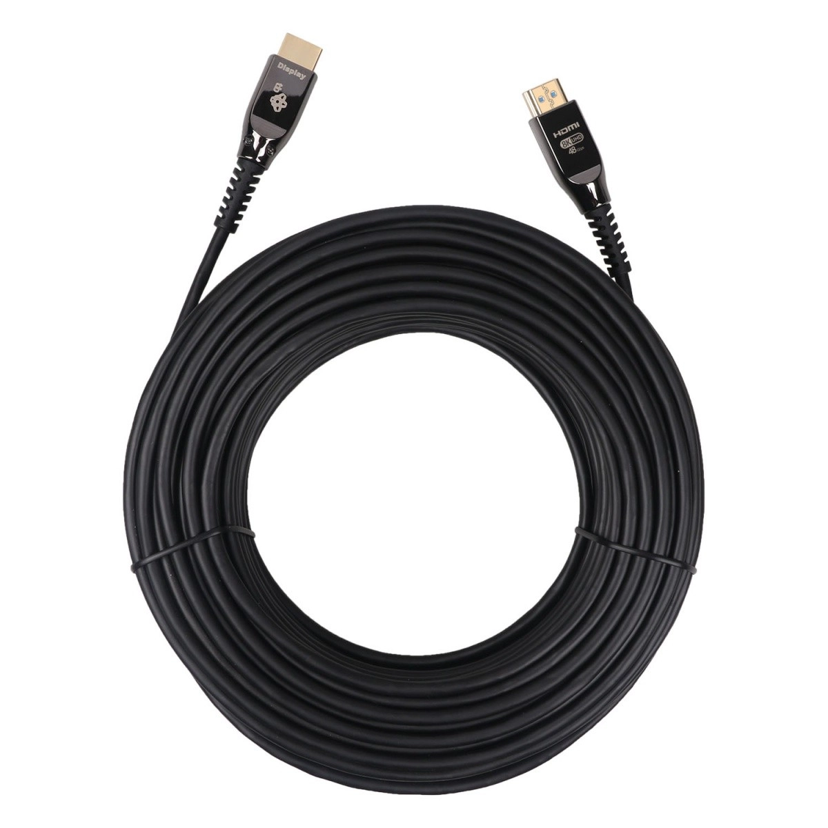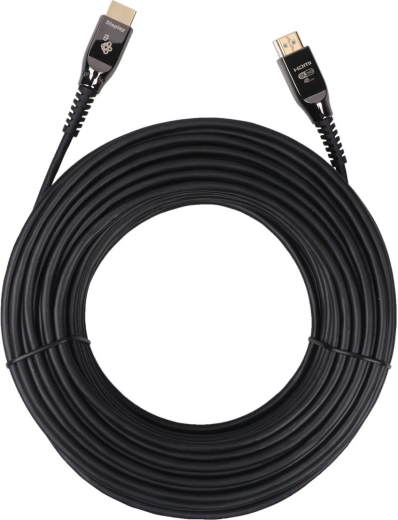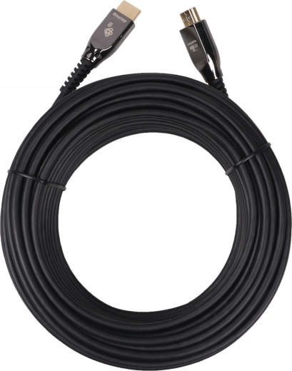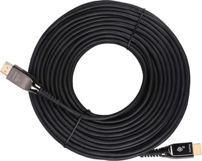 Câble optique HDMI 2.1 professionnel de 10 m transmettant une vidéo jusqu’en 8K et une bande passante de 48 Gb/s avec une fiabilité maximale. Grâce à la transmission optique (AOC), il maintient un signal stable et sans pertes même sur de longues distances. Des connecteurs plaqués or 24 carats garantissent une résistance à la corrosion et un contact sûr – idéal pour les salles de conférence, les salles de cours, la signalisation numérique et les cinémas maison exigeants.