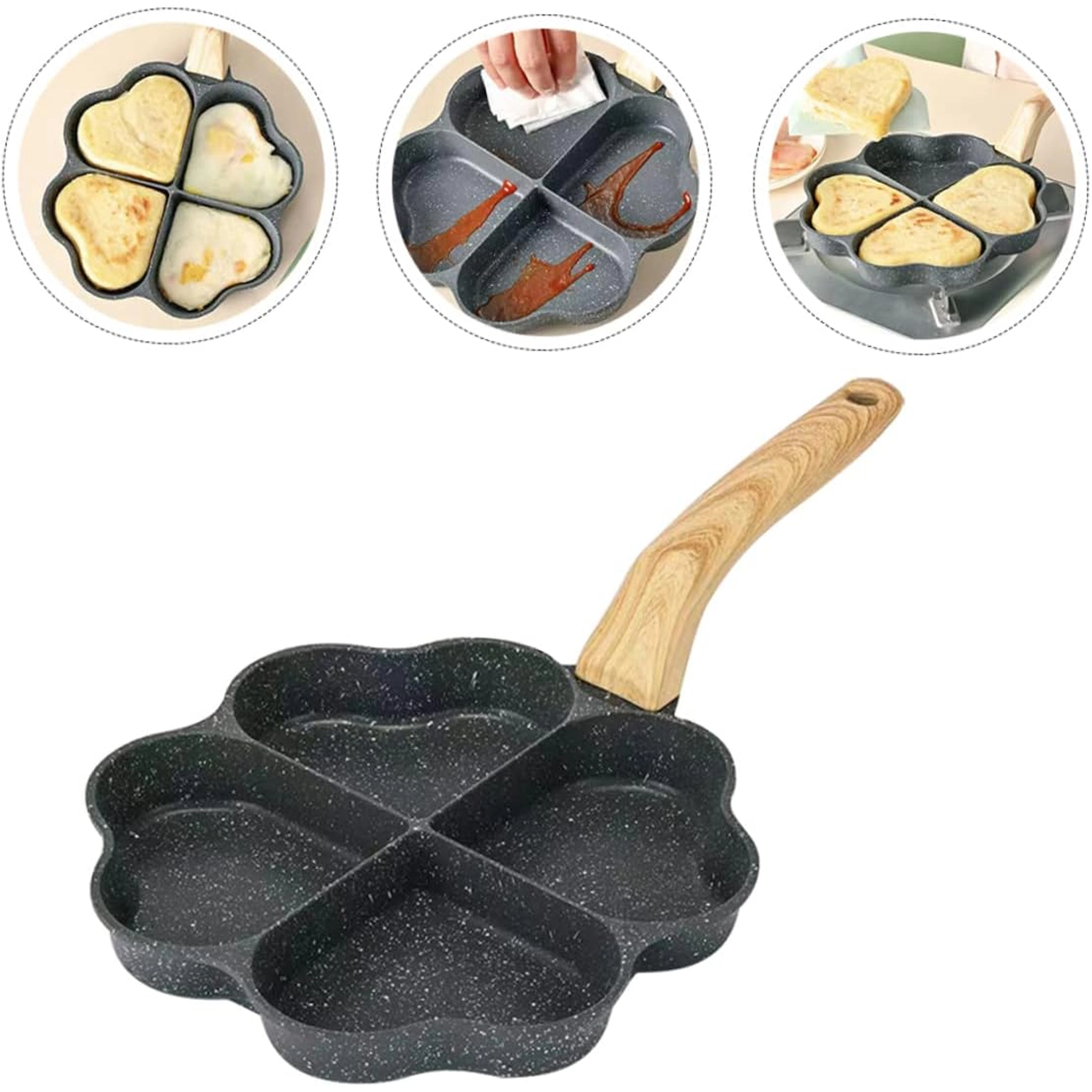 Découvrez une poêle pratique avec quatre moules en forme de cœur pour des pancakes, œufs au plat ou mini crêpes parfaitement formés. Grâce au revêtement antiadhésif et à la répartition uniforme de la chaleur, préparez un petit-déjeuner rapidement, sans brûler et avec un minimum d’huile. Compatibilité induction et poignée ergonomique aspect bois pour une cuisson confortable et une manipulation aisée.