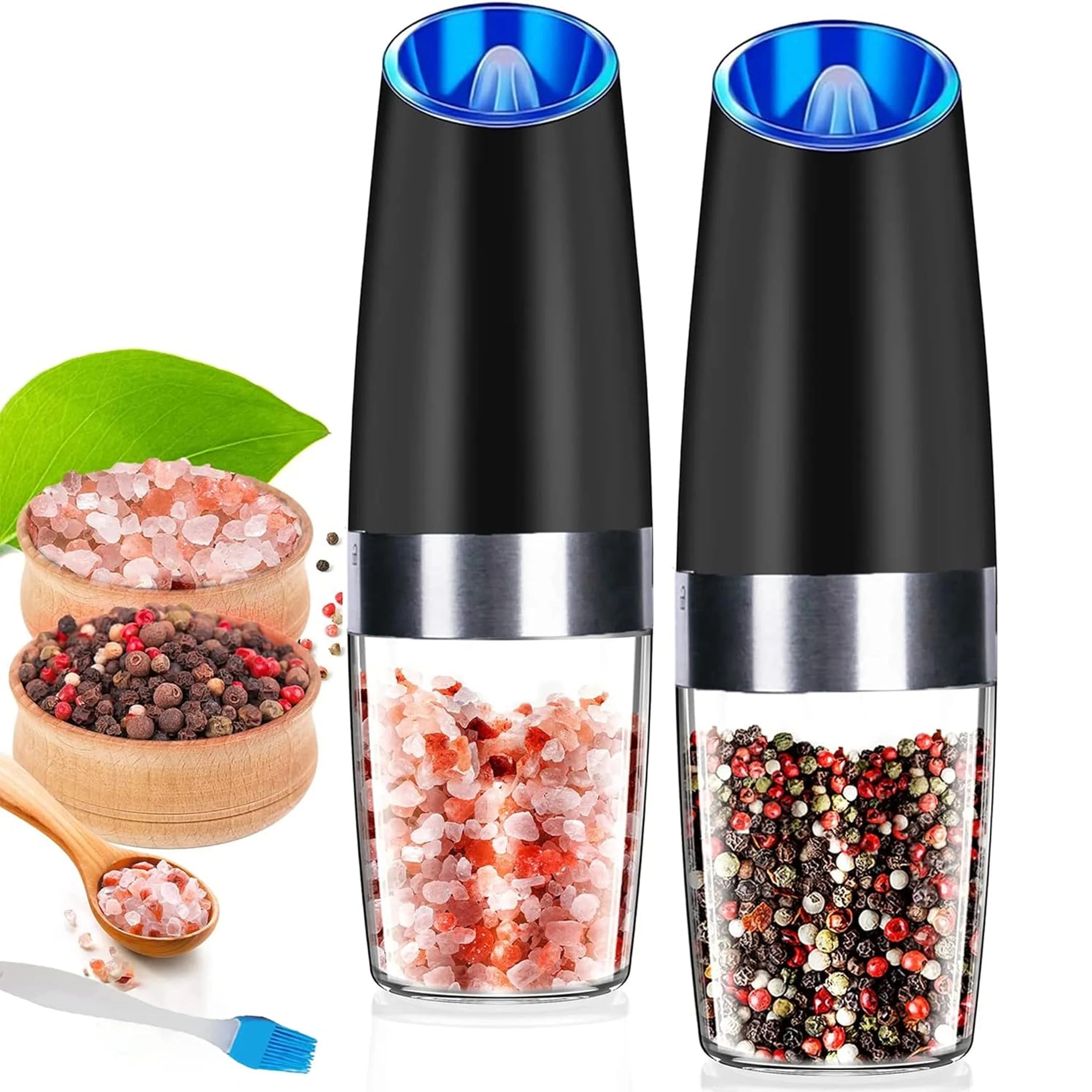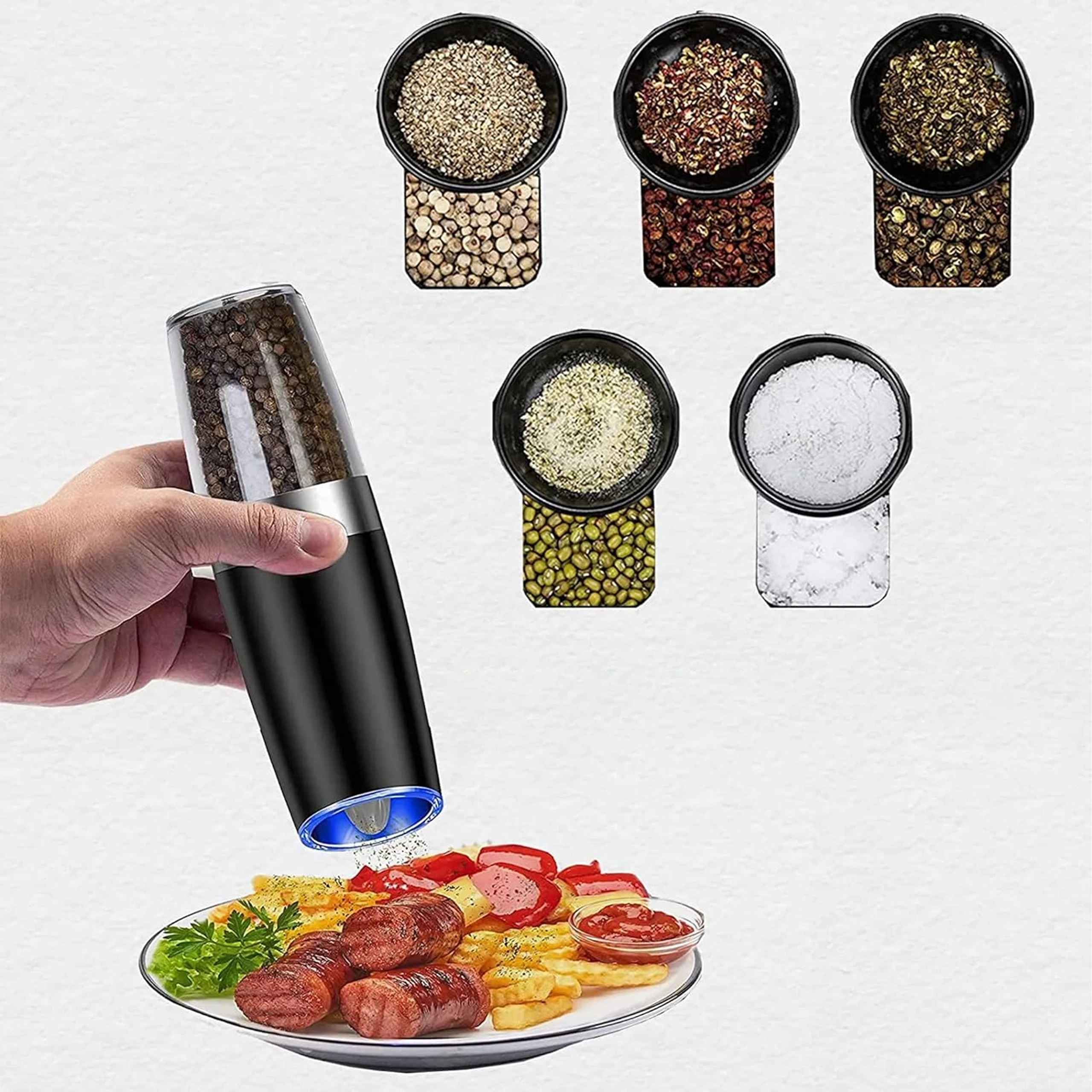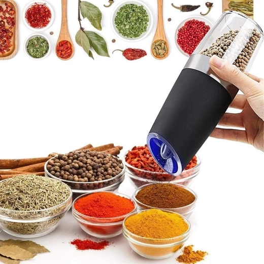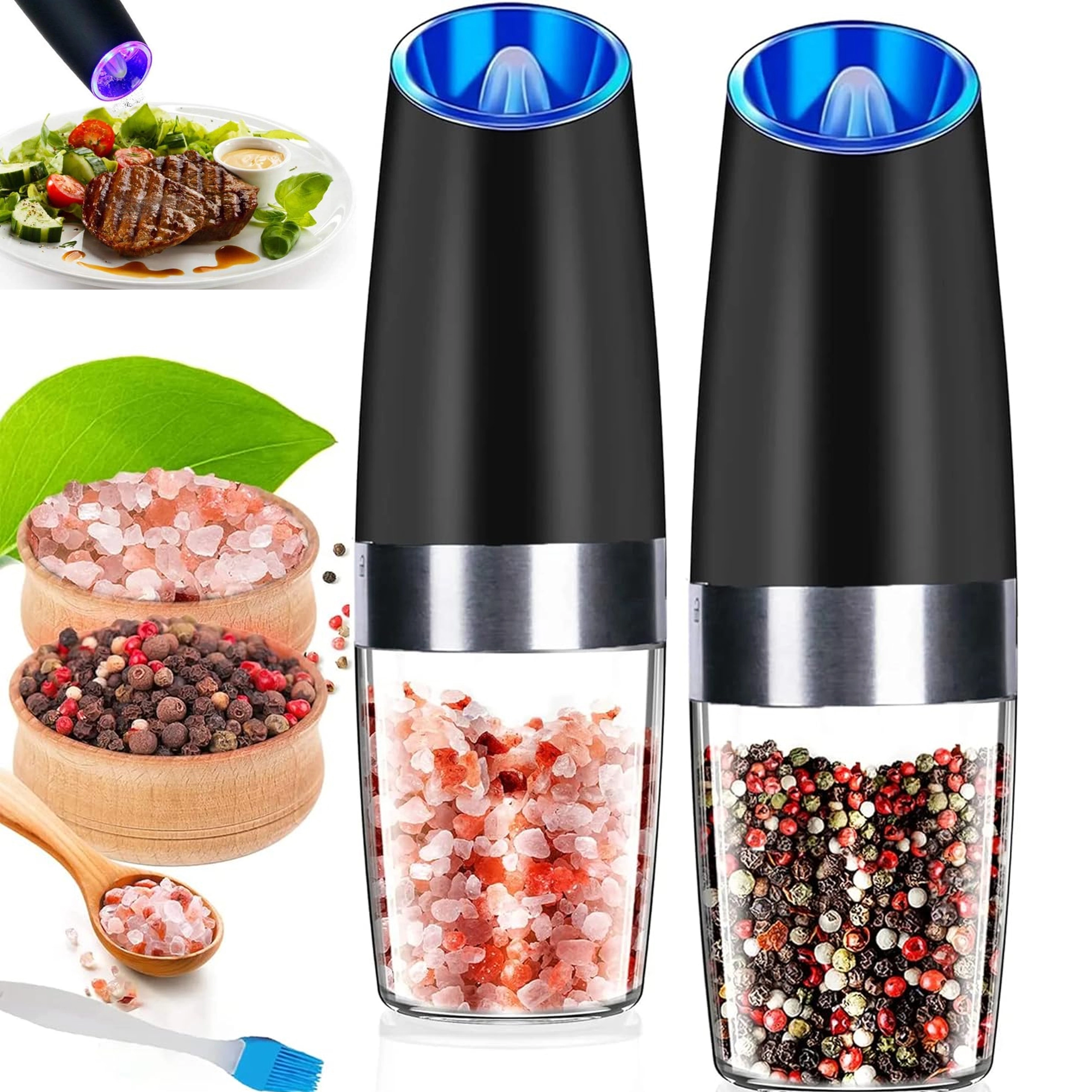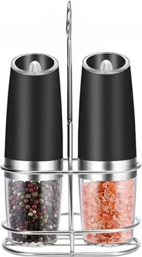 Découvrez le confort de l’assaisonnement quotidien avec un set de deux moulins électriques à déclenchement gravitationnel. Il suffit de les incliner pour moudre fraîchement le sel, le poivre ou d’autres épices – sans appuyer sur aucun bouton. Réservoir transparent pour un contrôle facile, réglage de la finesse de mouture et éclairage LED intégré pour un dosage précis font de ces moulins un accessoire à la fois élégant et pratique pour toute cuisine. Mouture automatique, utilisation à une main, lumière LED et design moderne pour le plan de travail.