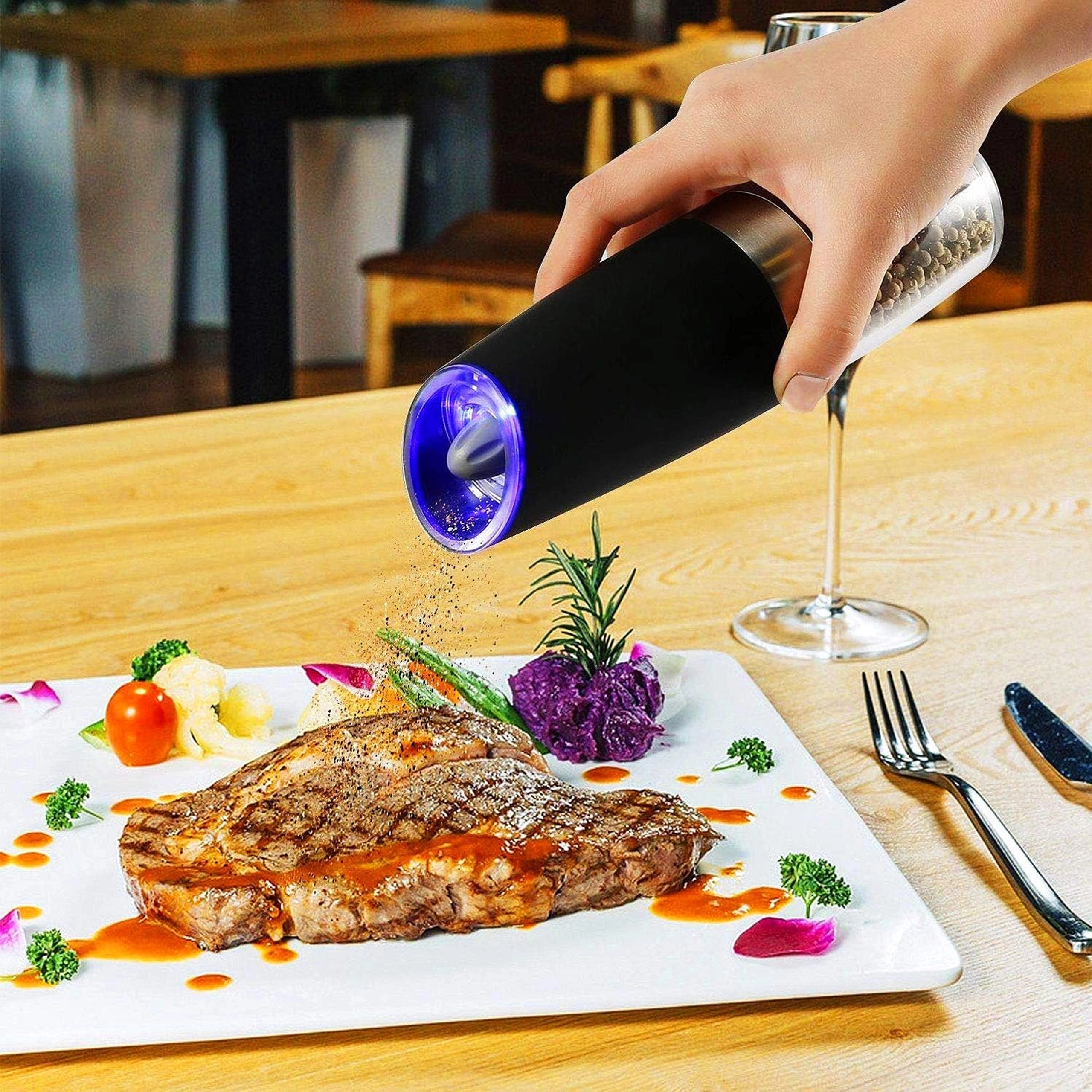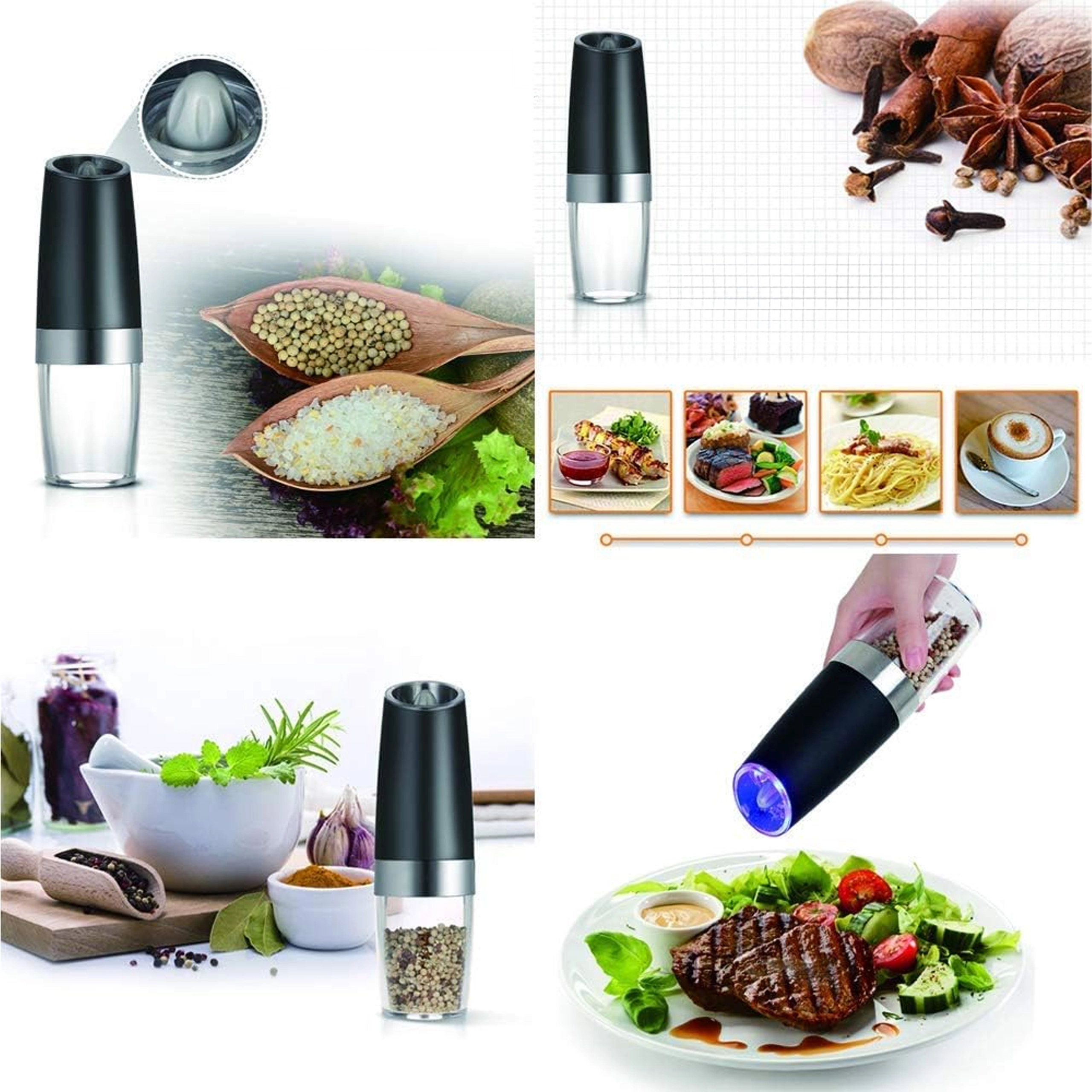 Le set comprend deux moulins électriques avec activation gravitationnelle – les épices commencent à être moulues automatiquement lorsque vous les inclinez au-dessus du plat. Grâce au réservoir transparent, vous gardez toujours un œil sur le niveau des ingrédients, et la finesse réglable vous permet de passer aisément d’une poudre fine à des grains plus grossiers.