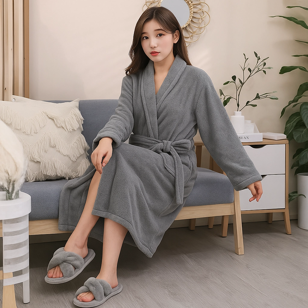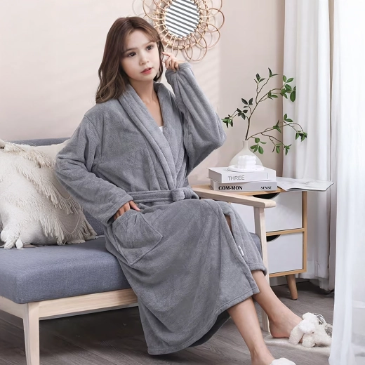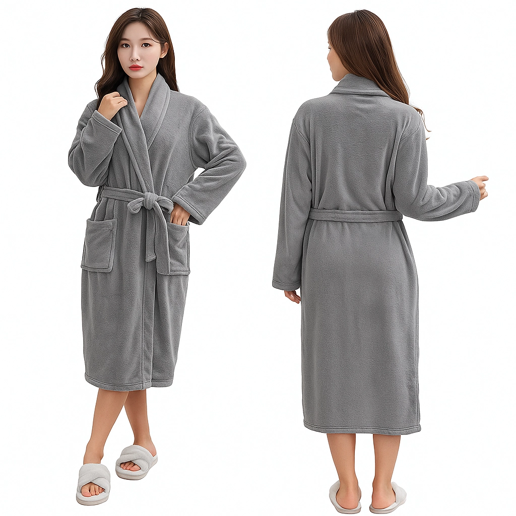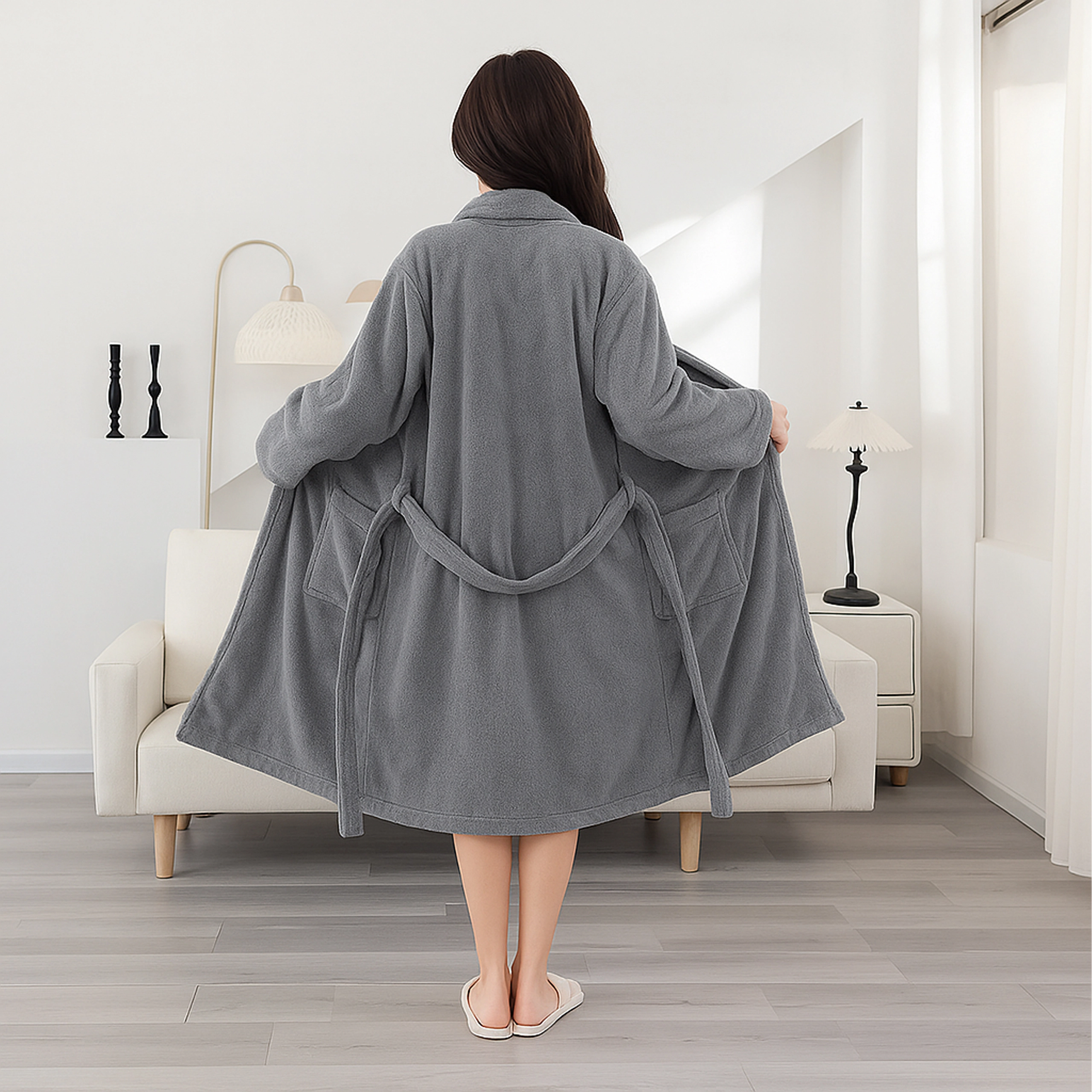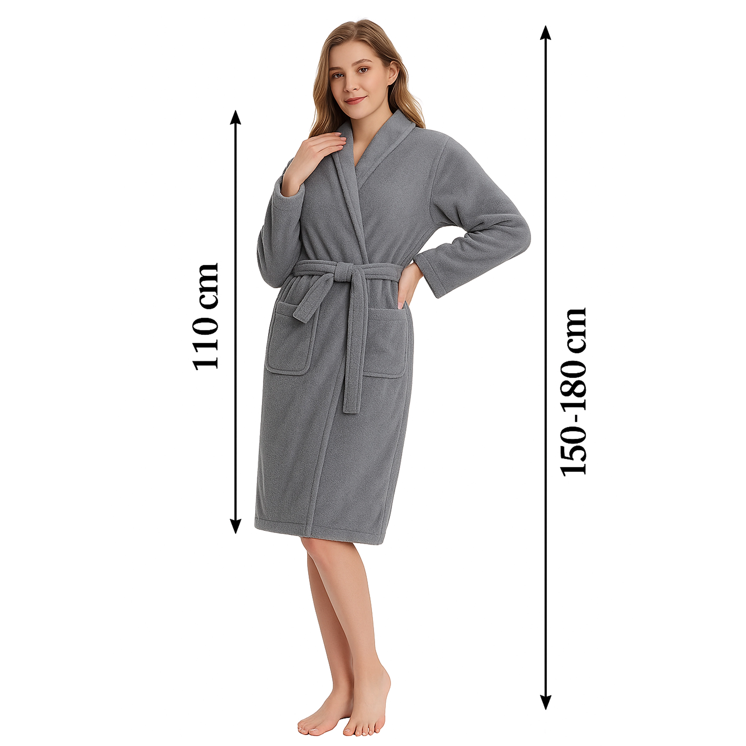 Le peignoir possède deux grandes poches plaquées pour vos petits objets et une longueur suffisante pour une couverture confortable. Grâce à sa matière douce et chaude, c’est un excellent choix pour les matins et soirées fraîches.