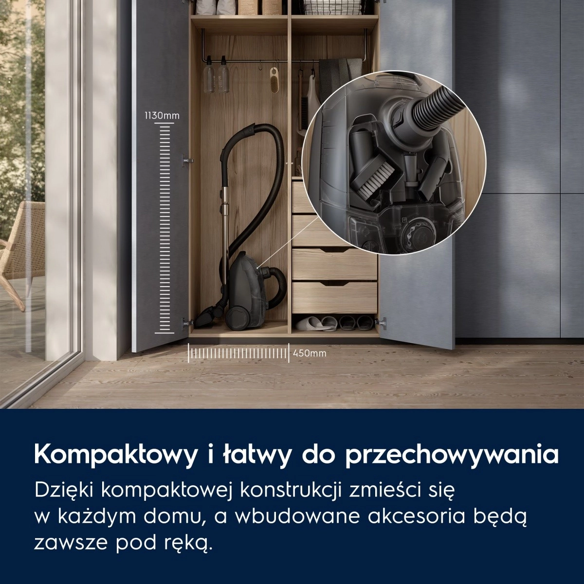 Léger, maniable et efficace – l’aspirateur avec sac Série 500 EB51C2GG gère le nettoyage quotidien sans effort. La nouvelle brosse de sol AllFloor, commutable via une pédale, traite aussi bien les sols durs que les tapis, tandis que la forte puissance d’aspiration assure l’élimination en profondeur de la poussière et des saletés en un seul passage.