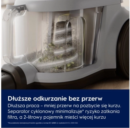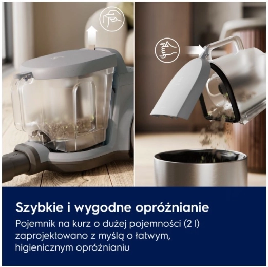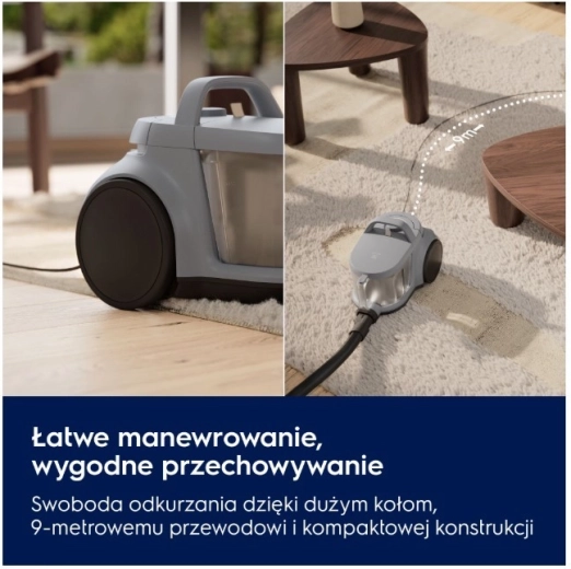 La technologie du séparateur cyclonique limite les obstructions et maintient des performances stables. Le réservoir à poussière de 2 l se retire facilement et se vide de façon hygiénique d’une seule main, sans salissures inutiles. Sa conception ergonomique et compacte, ses grandes roues et sa portée de 9 m facilitent la manipulation et le rangement.