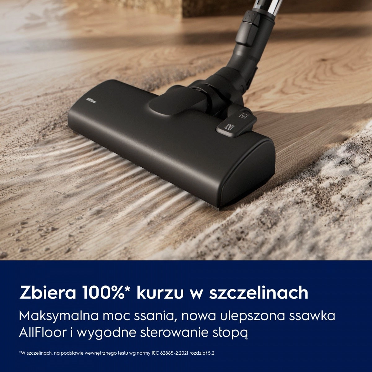 L’aspirateur offre une grande efficacité de collecte de la poussière dans les fentes et, avec la nouvelle brosse AllFloor, il gère aussi bien les sols durs que les tapis. Le changement de position de la brosse se fait aisément du pied.