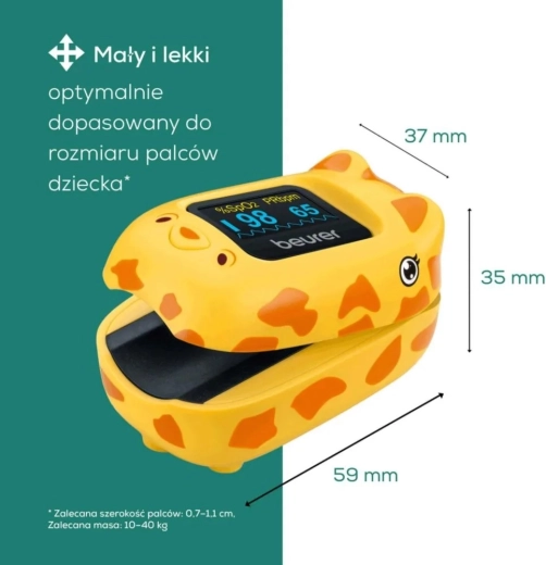 L’oxymètre de pouls pour enfants Beurer PO 13 Kids en adorable forme de girafe offre une mesure indolore de la saturation en oxygène (SpO2) et du pouls en quelques secondes. Il est adapté aux petits doigts d’enfants, dispose d’un écran couleur à orientation automatique et fournit des résultats fiables pour un contrôle de santé à domicile.