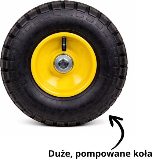 Quatre grandes roues à pneumatiques avec jantes en acier assurent stabilité, traction et guidage confortable du chariot sur gazon, gravier et dalle.