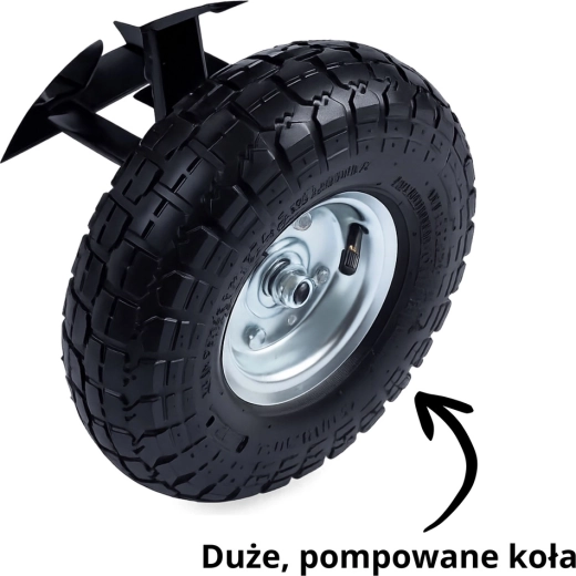 Des roues robustes en caoutchouc sur jantes métalliques assurent la stabilité et une progression fluide sur l’herbe, le gravier et les chemins irréguliers.