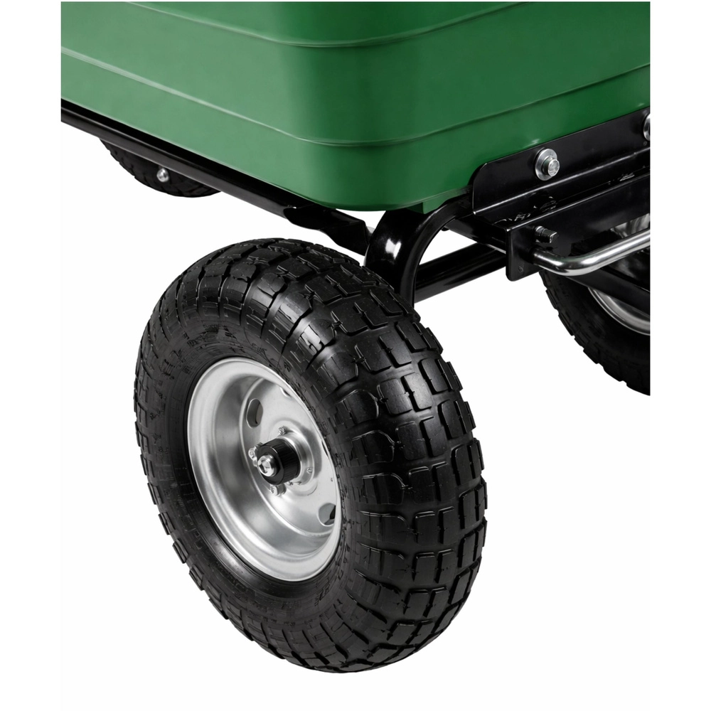 Pratique chariot de jardin avec une capacité de charge jusqu’à 120 kg pour faciliter le transport de terre, d’outils, d’engrais, de bois et de déchets verts. Quatre roues pneumatiques en caoutchouc assurent stabilité et conduite fluide sur l’herbe, le gravier et le sable. La benne amovible et basculante accélère le chargement et le déchargement, tandis que l’anneau d’attelage permet la connexion à un tracteur de jardin ou une tondeuse autoportée. Un assistant idéal pour les travaux quotidiens au jardin et autour de la maison.