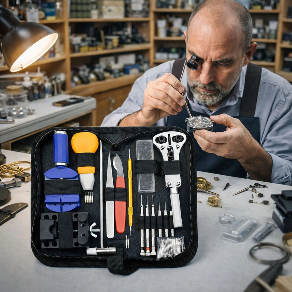 • Équipement complet : ouvre‑boîtier à clé, mors de rechange, tournevis de précision, chasse‑goupilles, outil pour barrettes, couteau à fond, support de boîtier, petit marteau, et plus encore.