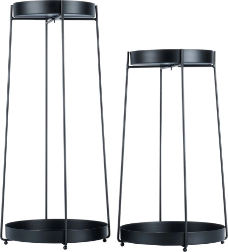 Élégant lot de deux supports à plantes en métal de hauteurs différentes pour une présentation stylée des plantes et des décorations. Design loft minimaliste en noir mat, structure stable, plateaux amovibles et dimensions pratiques pour l'appartement, le bureau et le balcon couvert.