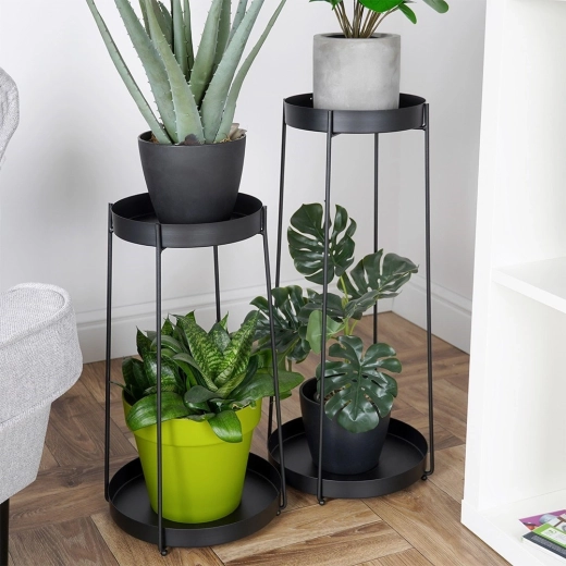 Découvrez une manière moderne de sublimer vos plantes d'intérieur. Les supports à deux niveaux en noir intemporel offrent une mise en valeur esthétique, une meilleure circulation de l'air et un entretien plus facile des environs. La combinaison de lignes fines et de plateaux métalliques solides avec rebord s'intègre parfaitement aux intérieurs loft, modernes et scandinaves.
