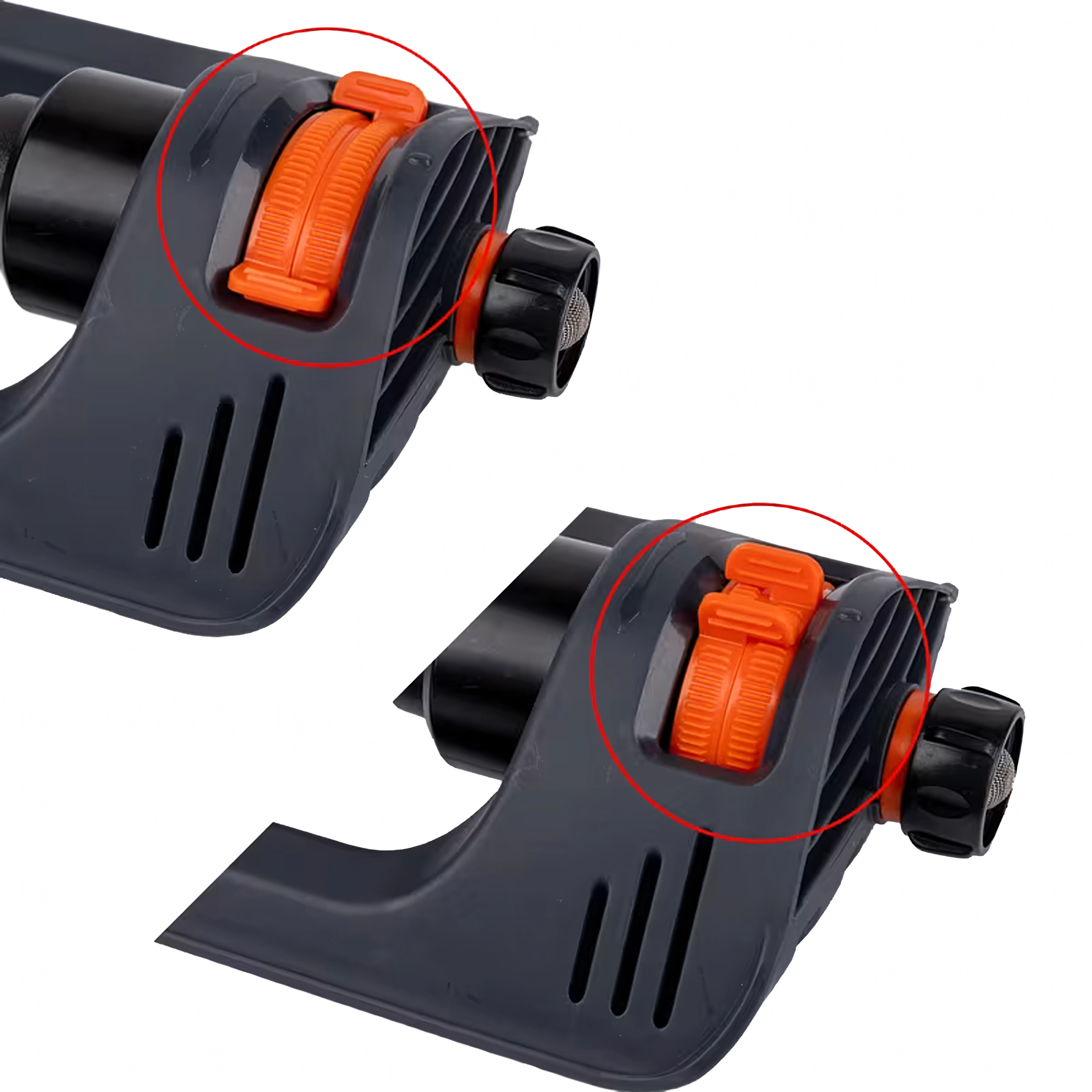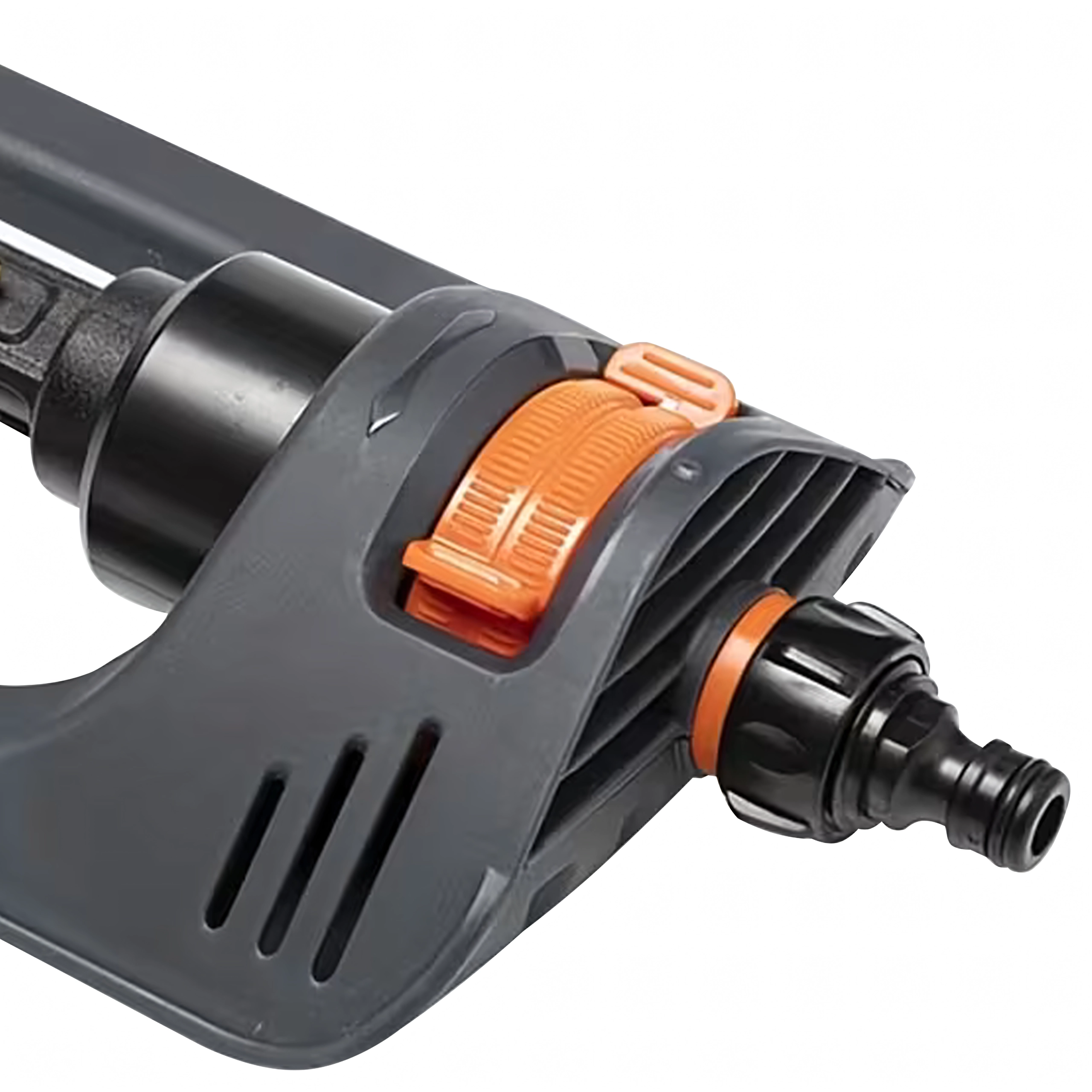 La construction durable avec un châssis stable à faible profil maintient fermement l’arroseur en place, tandis que le raccord rapide facilite la connexion à un tuyau d’arrosage standard. Les commandes de couleur contrastée garantissent un réglage rapide et intuitif du débit et de la largeur de pulvérisation.