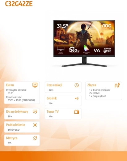 Le moniteur gaming AOC C32G42ZE offre une grande diagonale de 31,5" avec une dalle VA incurvée, proposant des couleurs riches, des noirs profonds et un large contraste pour les films comme pour les jeux. Le taux de rafraîchissement de 240 Hz minimise le flou et assure une fluidité exceptionnelle lors des actions rapides.