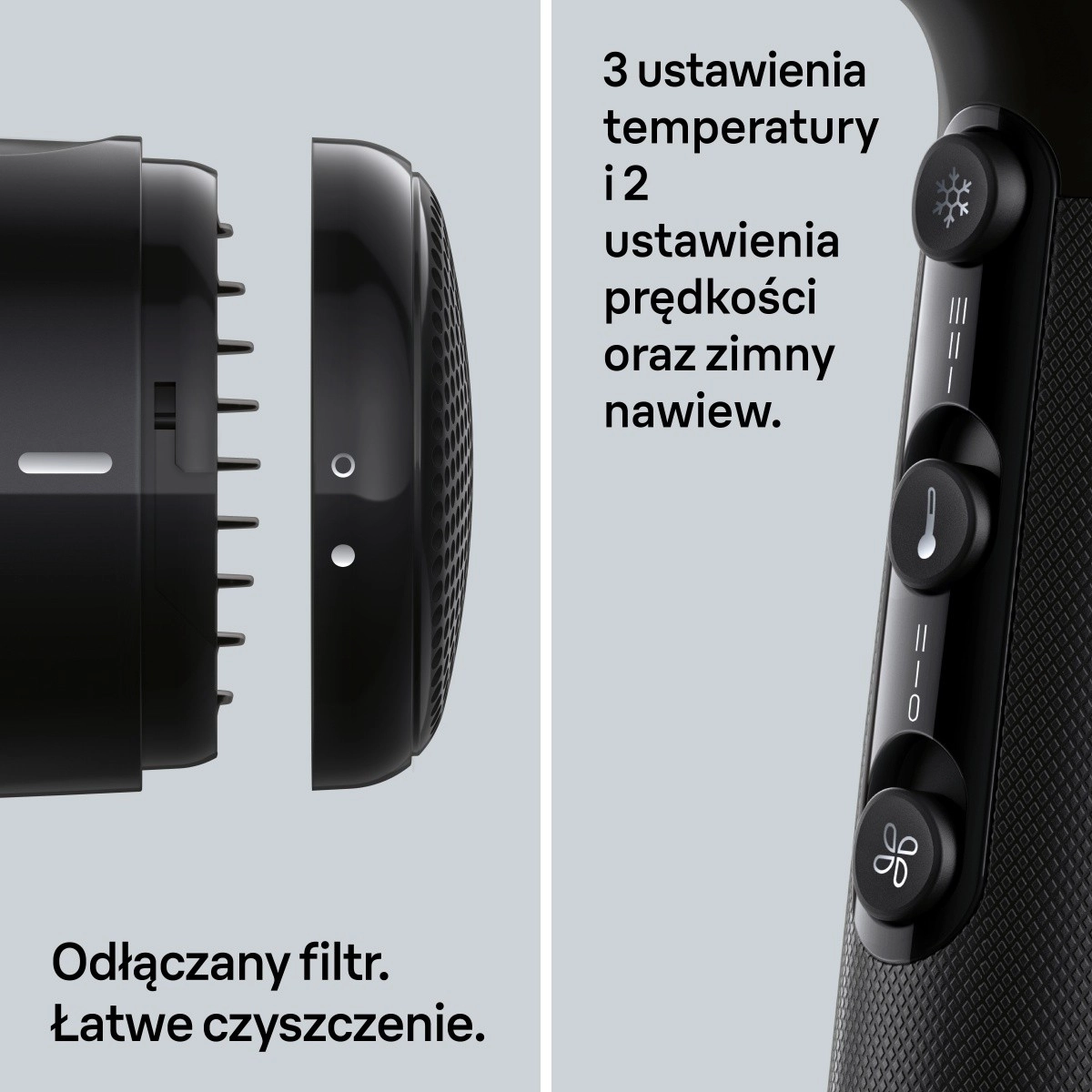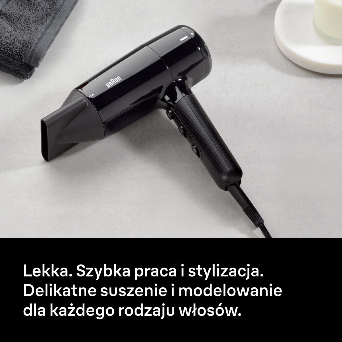 Profitez d’un séchage rapide et doux grâce à la puissance de 2000 W et au flux d’air dirigé avec précision. Le sèche-cheveux est conçu pour une utilisation quotidienne confortable – il est léger, ergonomique et doté d’une poignée antidérapante qui tient parfaitement en main. Grâce au diffuseur et au concentrateur, créez facilement du volume, des ondulations ou un lissage impeccable.