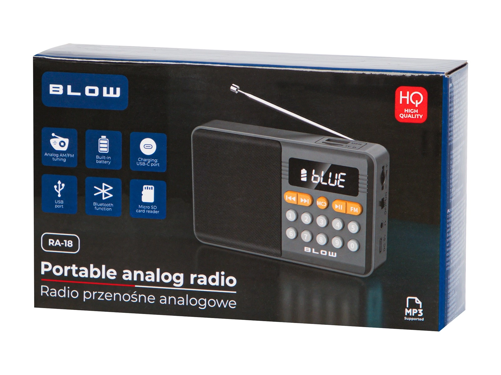 La BLOW RA18 est une radio portable pratique qui associe la réception analogique AM/FM à une connectivité moderne. En tant que haut‑parleur Bluetooth sans fil, elle lit la musique depuis un téléphone, un ordinateur portable ou une tablette, tout en prenant en charge les MP3 depuis cartes microSD et clés USB. Grâce à ses dimensions compactes, sa dragonne et ses commandes claires, elle est idéale en voyage, au bureau ou sur chantier.