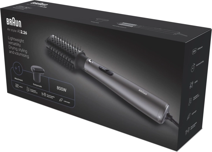 Découvrez un coiffage quotidien sans effort. La brosse à air chaud de 800 W combine séchage et mise en forme en une seule étape, pour créer en quelques minutes des coiffures lisses, souples et volumineuses. Grâce à l’ionisation, les cheveux sont plus brillants, moins électriques et tiennent mieux la forme.