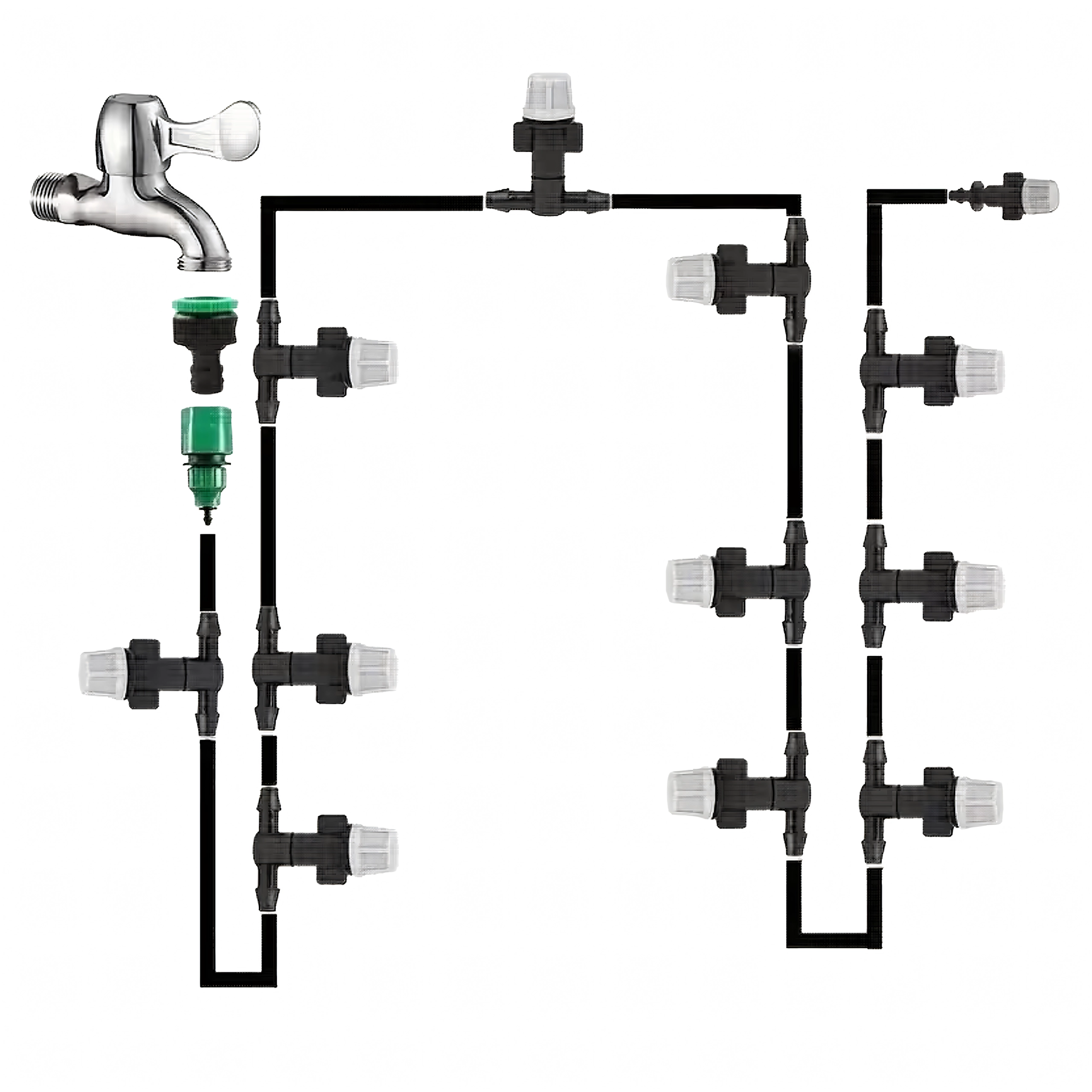 Les connecteurs modulaires permettent d’étendre facilement le système et de régler la direction et l’intensité du jet avec précision selon les besoins des plantes.