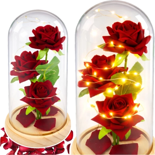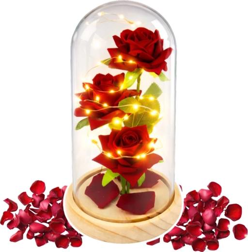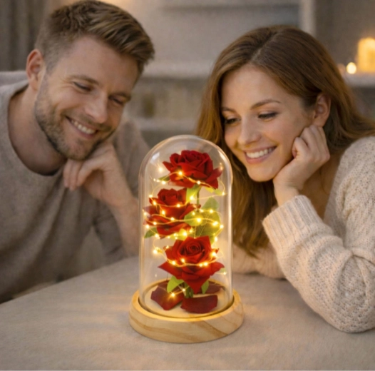 Les roses éternelles sous cloche allient élégance intemporelle et design moderne. De délicates guirlandes lumineuses LED entourent les fleurs et mettent en valeur le rouge intense, créant une lumière douce et romantique pour l’ambiance du soir. Cette décoration se démarque sur une table, une commode ou une table de chevet, et convient aux maisons, restaurants et hôtels.