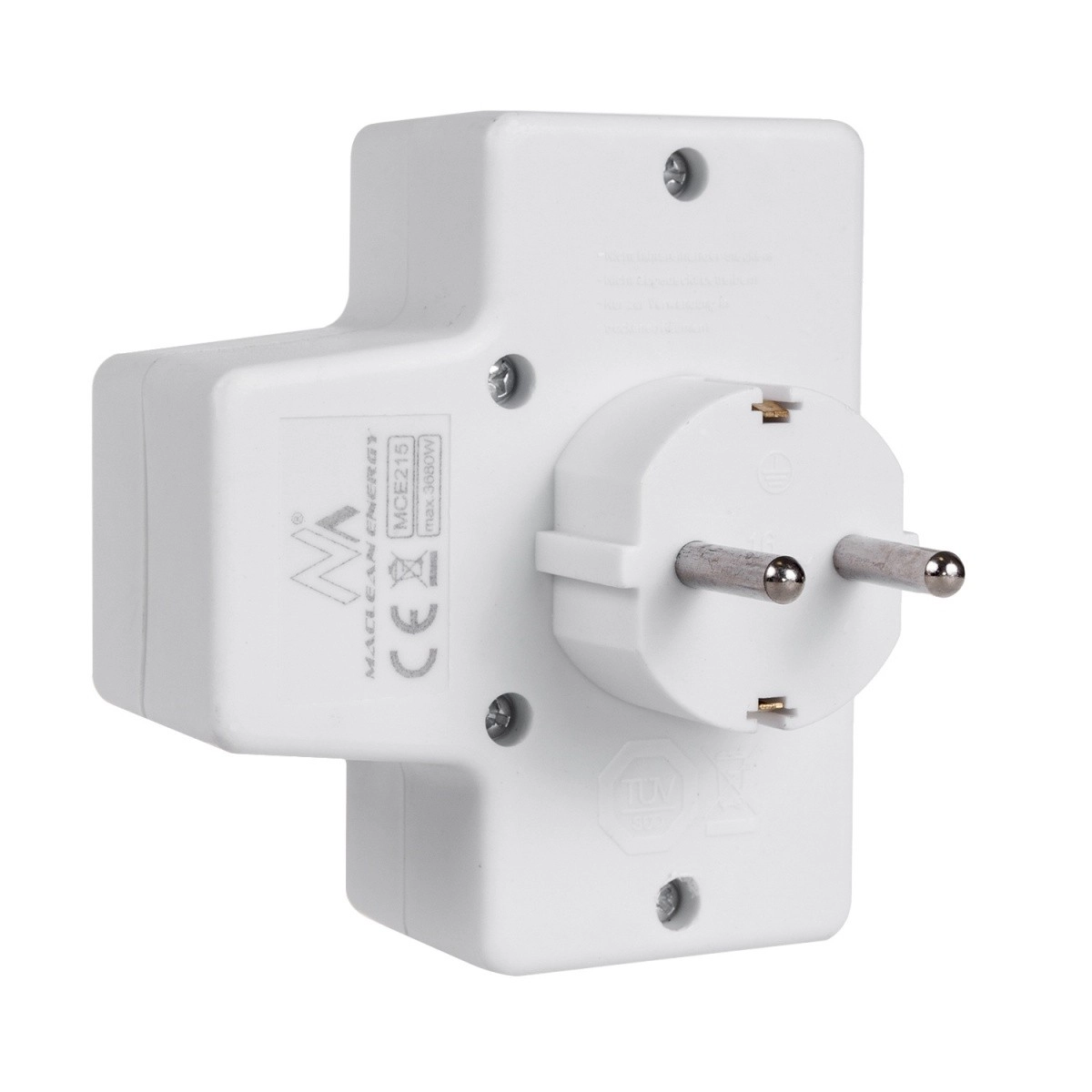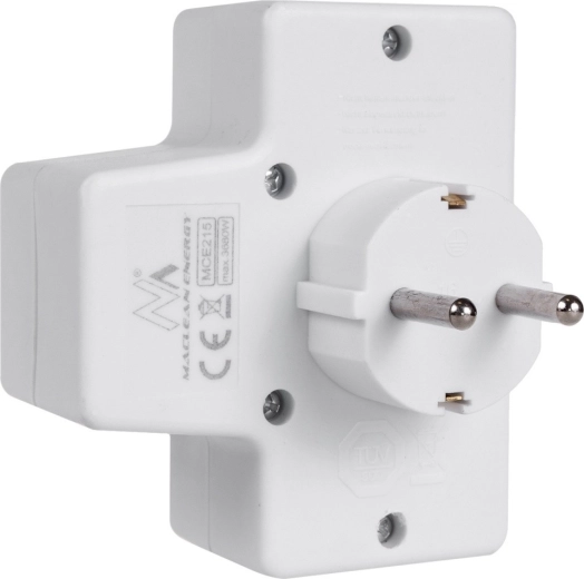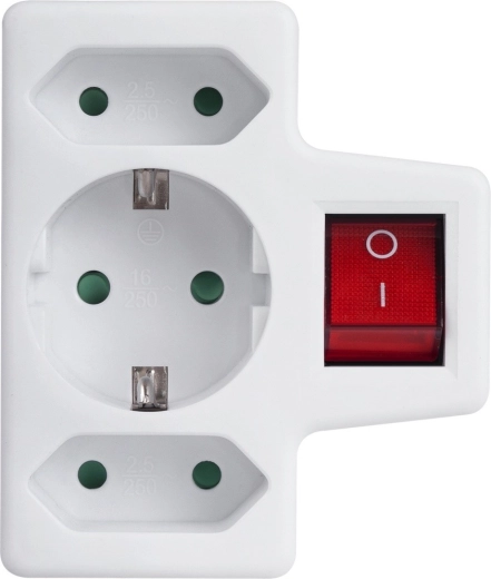 Adaptateur de prise pratique avec une sortie Schuko 16 A et deux sorties Euro 2,5 A, permettant de connecter plusieurs appareils simultanément sans rallonges. L’interrupteur intégré économise l’énergie en coupant tous les appareils connectés d’une seule pression, et la sécurité enfant augmente la sûreté à la maison.
