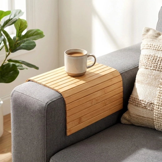 Les lamelles s’adaptent à la forme de l’accoudoir et créent une surface plane pour une tasse, un verre ou de petits objets – une solution pratique sans table d’appoint.