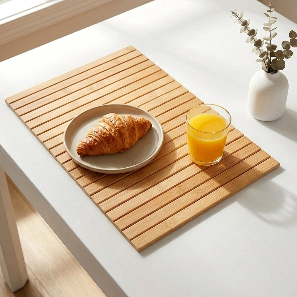 Pratique, le tapis en bambou protège la table et autres surfaces lors des repas comme au quotidien. Grâce à sa construction enroulable, il se range facilement dans un tiroir, offre un aspect naturel et est résistant à l’usure courante. Il peut également servir de plateau sur l’accoudoir du canapé pour une tasse ou de petits objets.